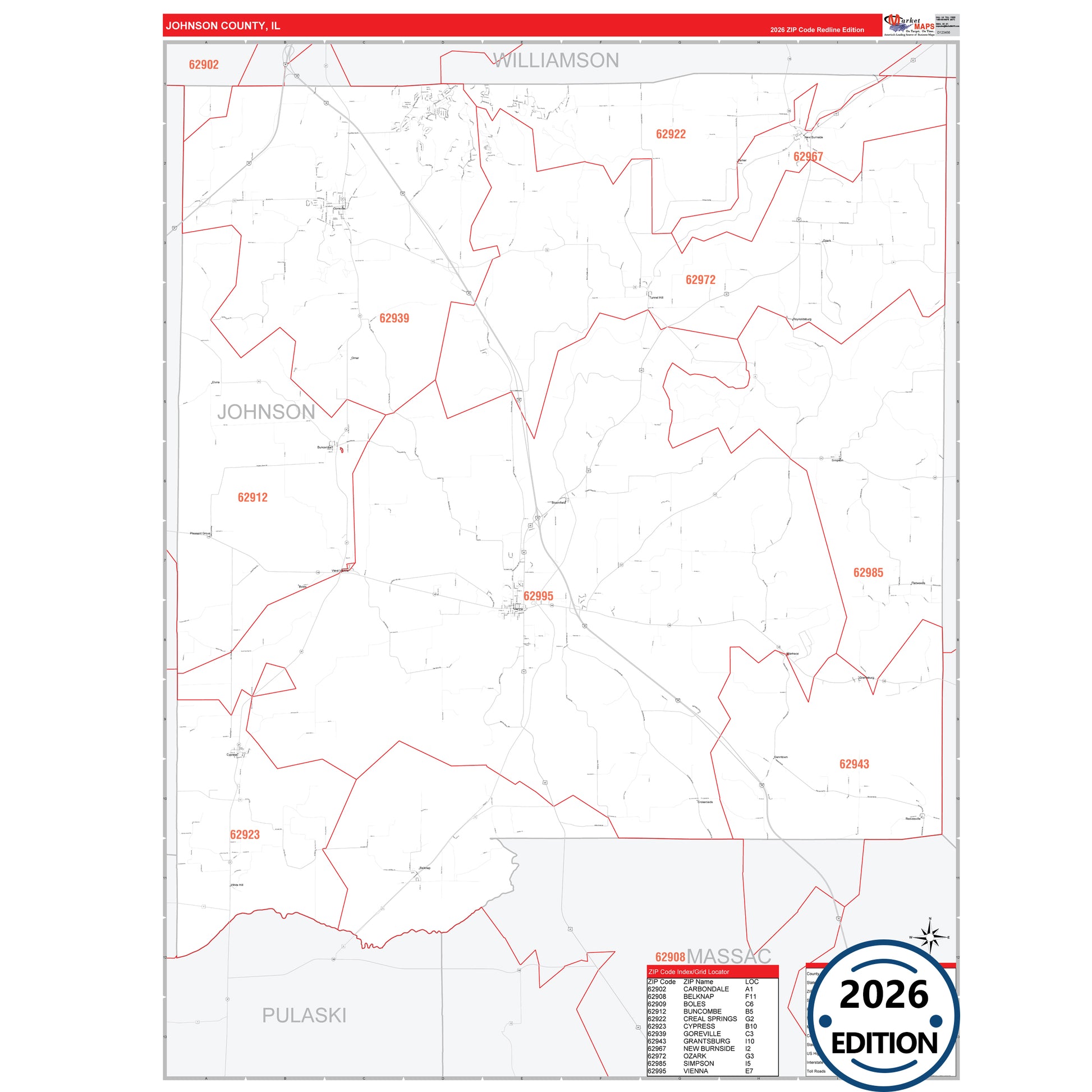 The RedLine Style map of Johnson County, IL shows ZIP code areas overlaid on a detailed road network of Johnson County, Illinois. Ideal for drawing locations, territories, and other applications. Base map features include all major streets and highways labeled, cities and towns, county and state boundaries, neighborhood names, railroads, and a clean white background suitable for marking and planning.