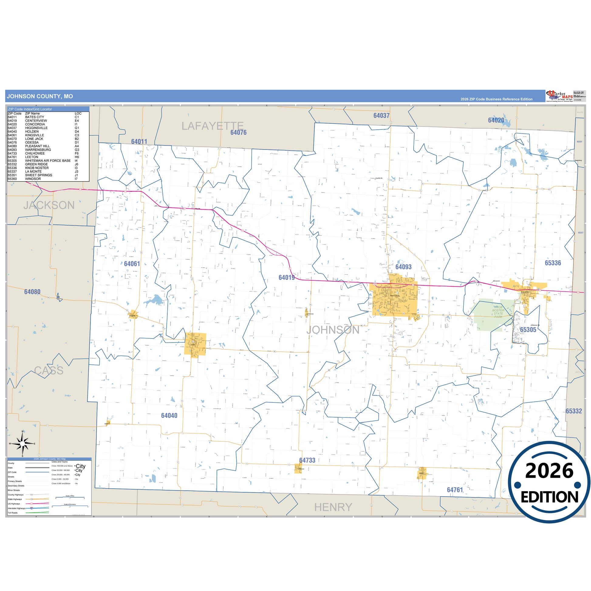 The Business Reference Style Johnson County, MO is a detailed map that includes all towns, cities, major roadways, and highways. Available in multiple wall map sizes, perfect for home, school, office, or business display.