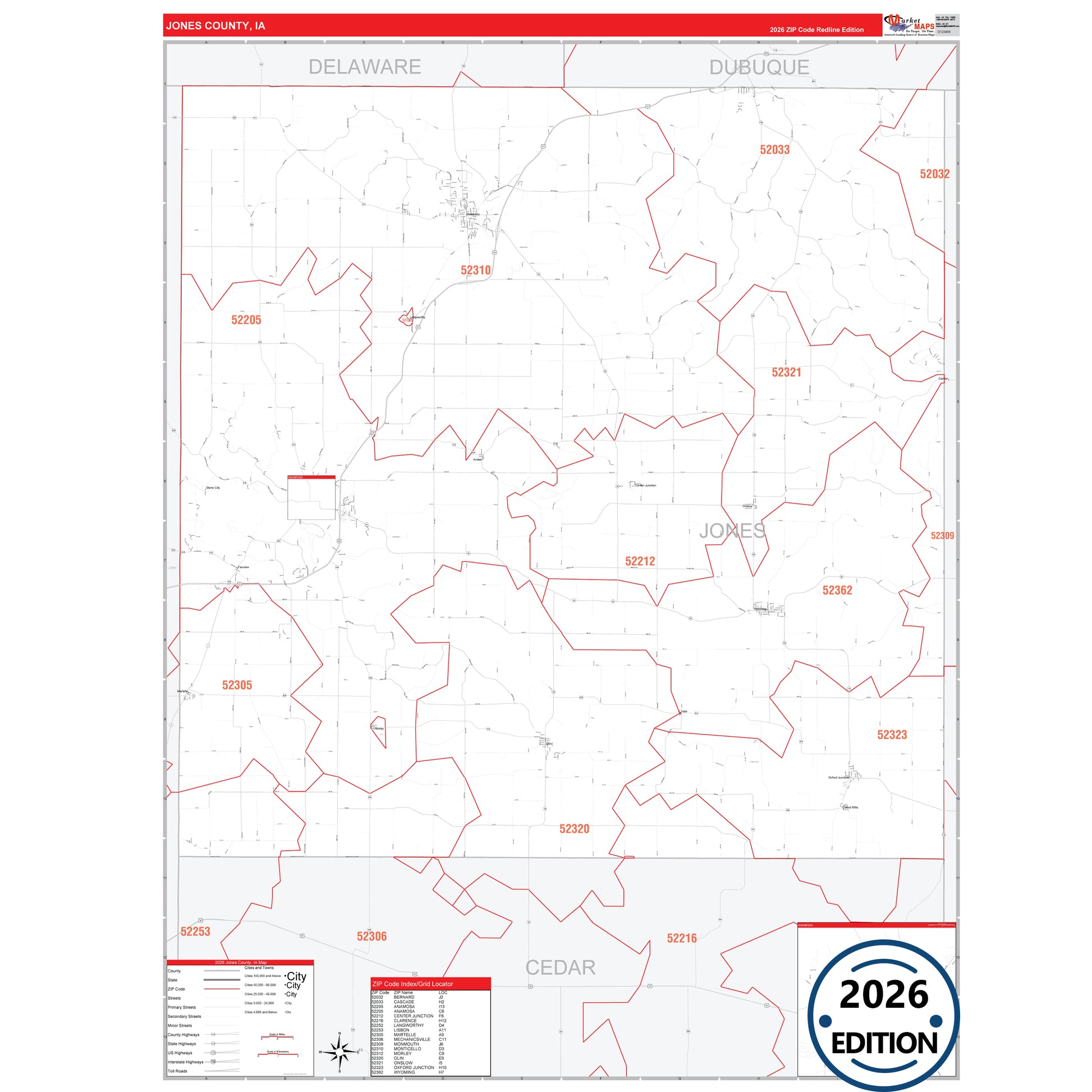The RedLine Style map of Jones County, IA shows ZIP code areas overlaid on a detailed road network of Jones County, Iowa. Ideal for drawing locations, territories, and other applications. Base map features include all major streets and highways labeled, cities and towns, county and state boundaries, neighborhood names, railroads, and a clean white background suitable for marking and planning.