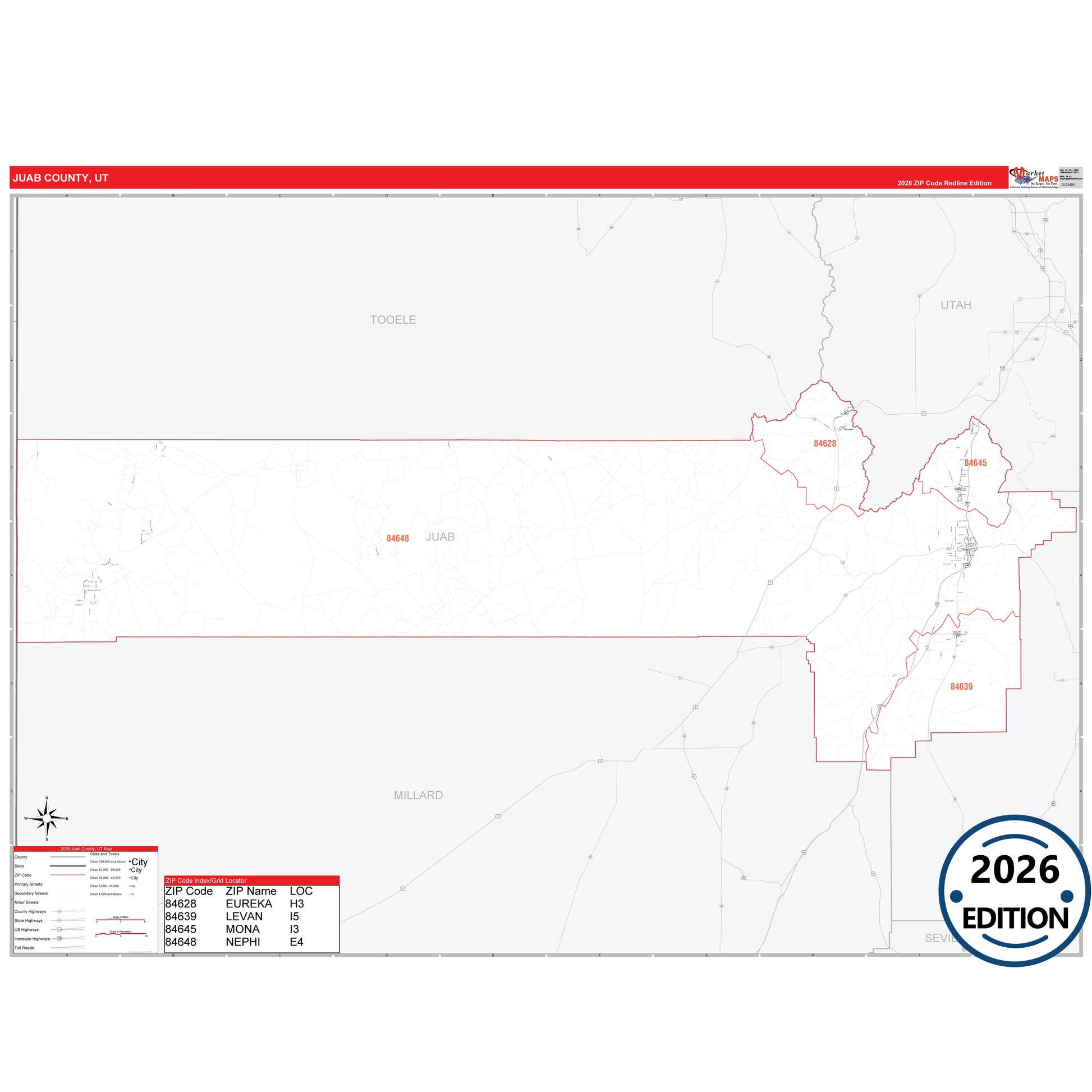 The RedLine Style map of Juab County, UT shows ZIP code areas overlaid on a detailed road network of Juab County, Utah. Ideal for drawing locations, territories, and other applications. Base map features include all major streets and highways labeled, cities and towns, county and state boundaries, neighborhood names, railroads, and a clean white background suitable for marking and planning.