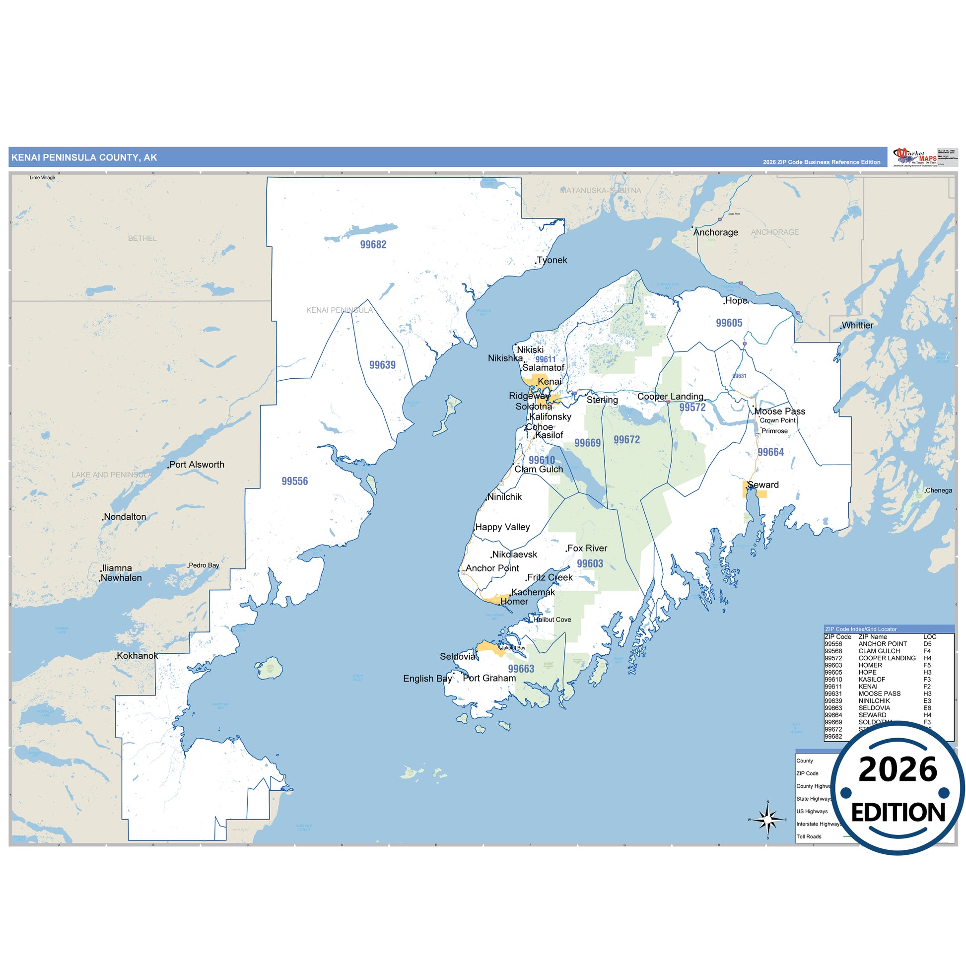 The Business Reference Style Kenai Peninsula County, AK is a detailed map that includes all towns, cities, major roadways, and highways. Available in multiple wall map sizes, perfect for home, school, office, or business display.