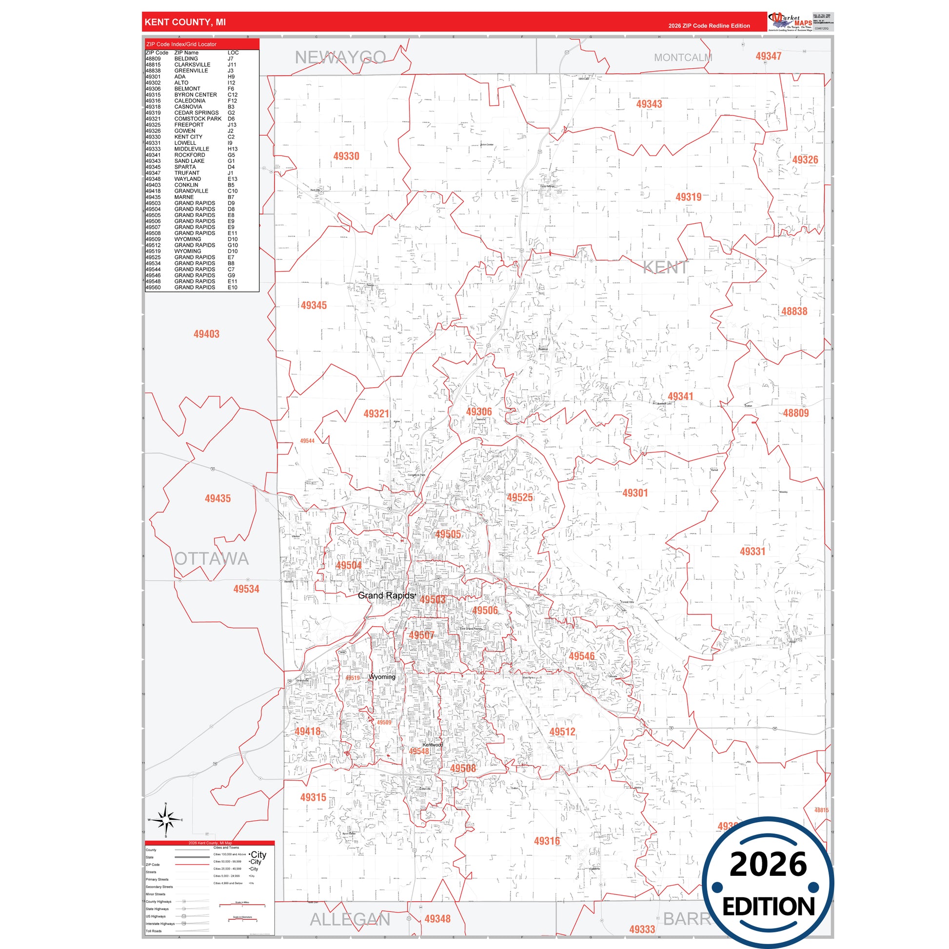 The RedLine Style map of Kent County, MI shows ZIP code areas overlaid on a detailed road network of Kent County, Michigan. Ideal for drawing locations, territories, and other applications. Base map features include all major streets and highways labeled, cities and towns, county and state boundaries, neighborhood names, railroads, and a clean white background suitable for marking and planning.