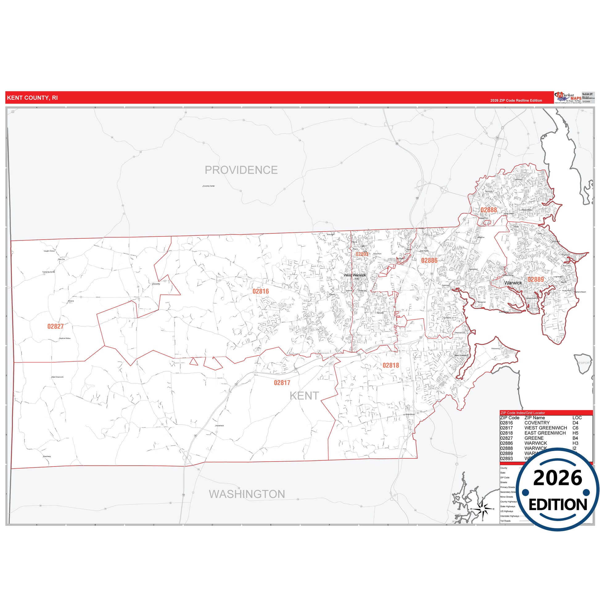 The RedLine Style map of Kent County, RI shows ZIP code areas overlaid on a detailed road network of Kent County, Rhode Island. Ideal for drawing locations, territories, and other applications. Base map features include all major streets and highways labeled, cities and towns, county and state boundaries, neighborhood names, railroads, and a clean white background suitable for marking and planning.
