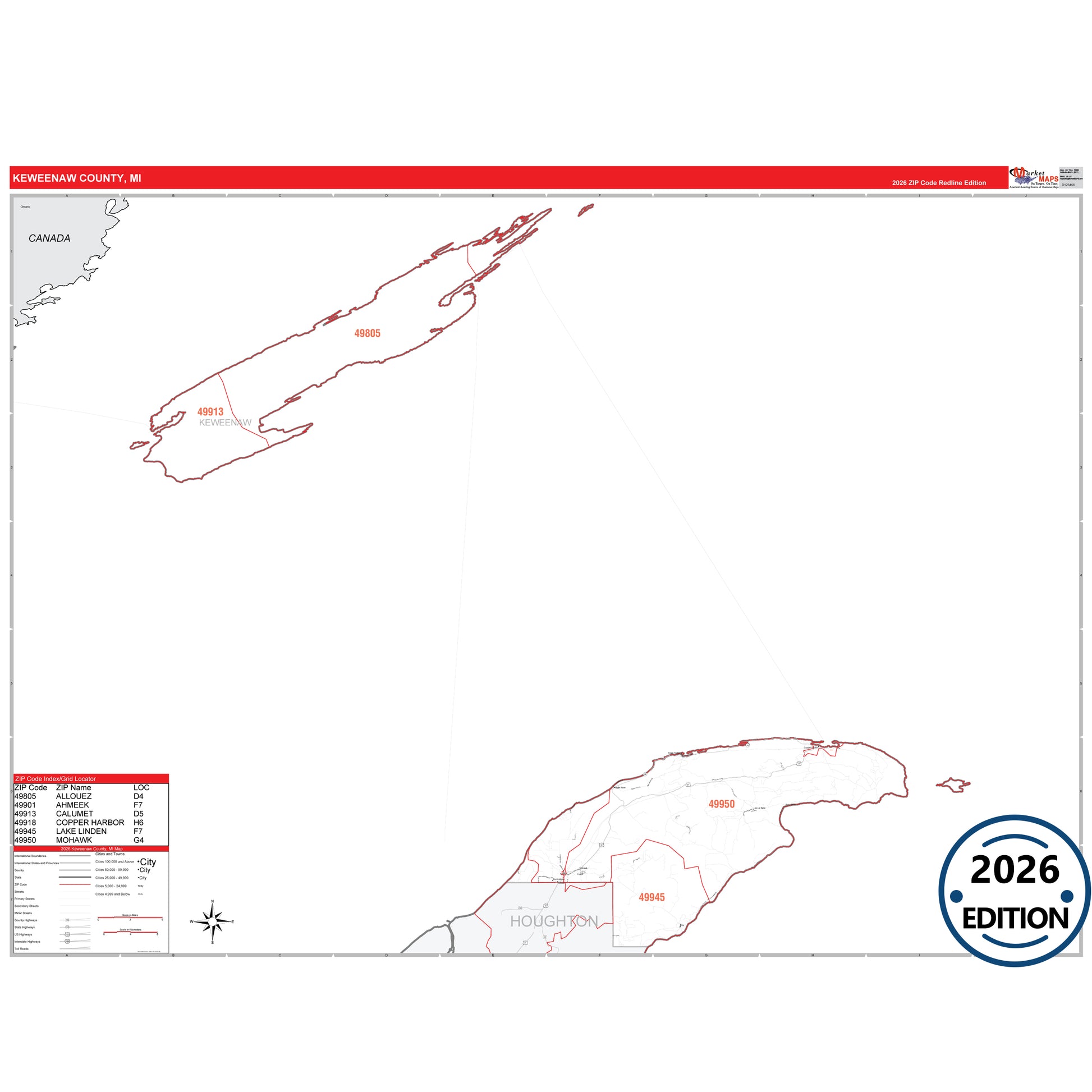 The RedLine Style map of Keweenaw County, MI shows ZIP code areas overlaid on a detailed road network of Keweenaw County, Michigan. Ideal for drawing locations, territories, and other applications. Base map features include all major streets and highways labeled, cities and towns, county and state boundaries, neighborhood names, railroads, and a clean white background suitable for marking and planning.