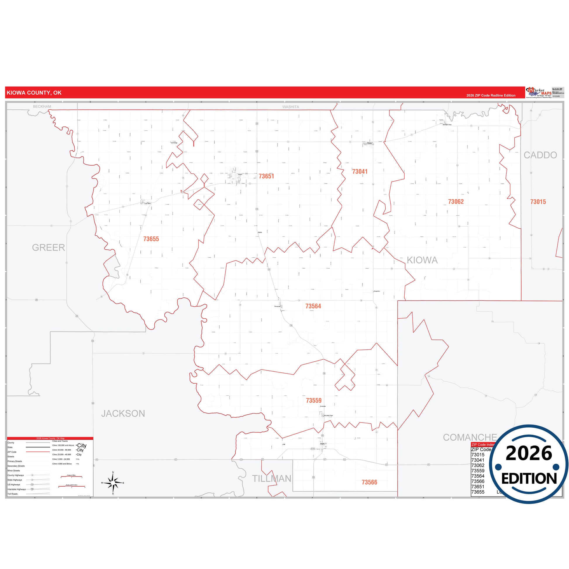 The RedLine Style map of Kiowa County, OK shows ZIP code areas overlaid on a detailed road network of Kiowa County, Oklahoma. Ideal for drawing locations, territories, and other applications. Base map features include all major streets and highways labeled, cities and towns, county and state boundaries, neighborhood names, railroads, and a clean white background suitable for marking and planning.