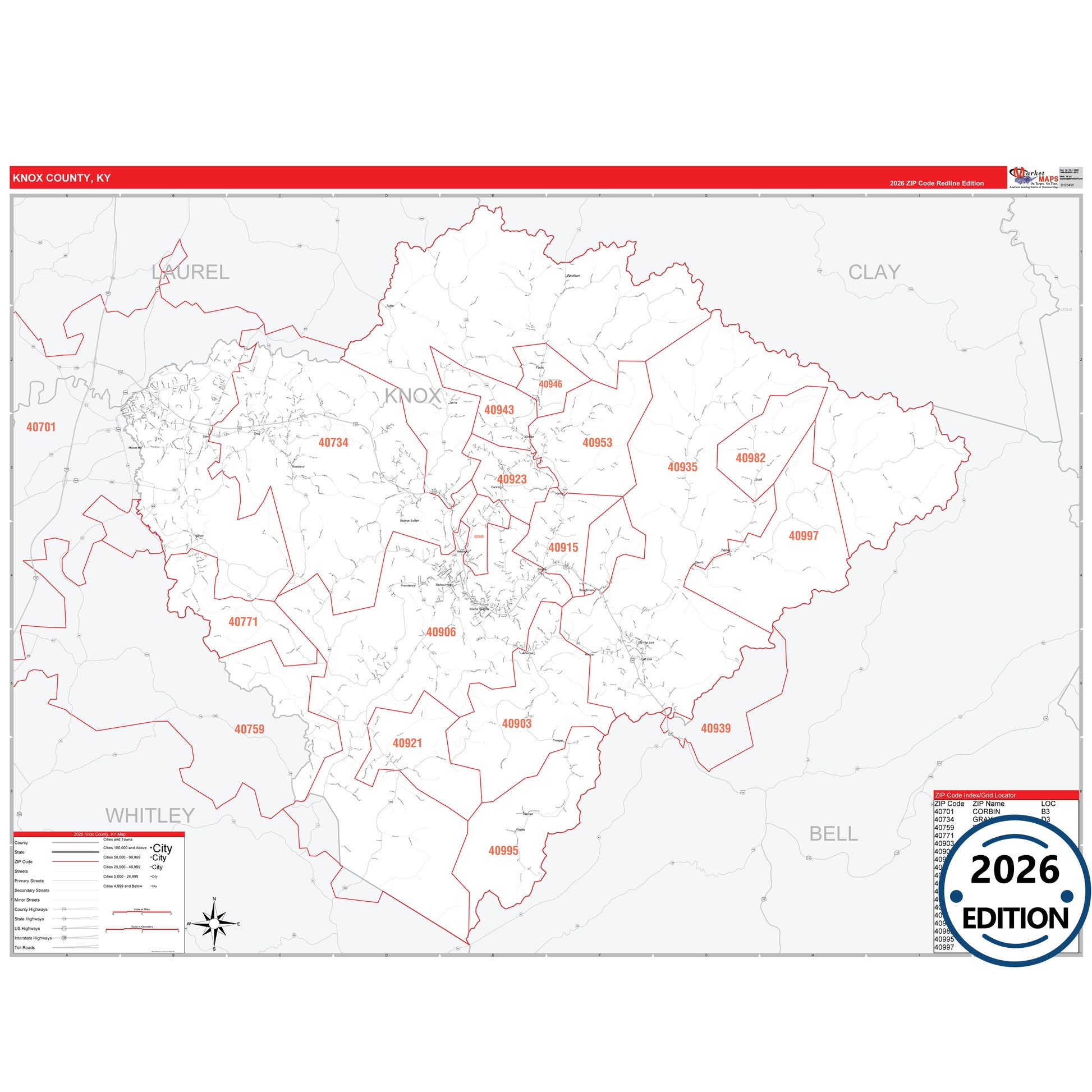 The RedLine Style map of Knox County, KY shows ZIP code areas overlaid on a detailed road network of Knox County, Kentucky. Ideal for drawing locations, territories, and other applications. Base map features include all major streets and highways labeled, cities and towns, county and state boundaries, neighborhood names, railroads, and a clean white background suitable for marking and planning.