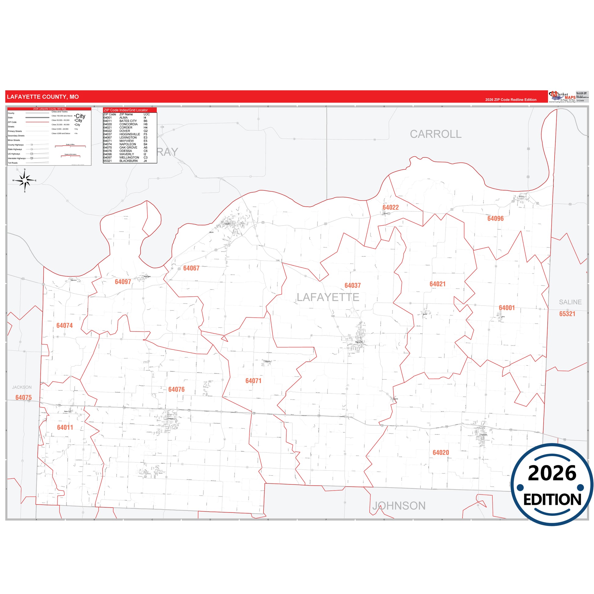 The RedLine Style map of Lafayette County, MO shows ZIP code areas overlaid on a detailed road network of Lafayette County, Missouri. Ideal for drawing locations, territories, and other applications. Base map features include all major streets and highways labeled, cities and towns, county and state boundaries, neighborhood names, railroads, and a clean white background suitable for marking and planning.