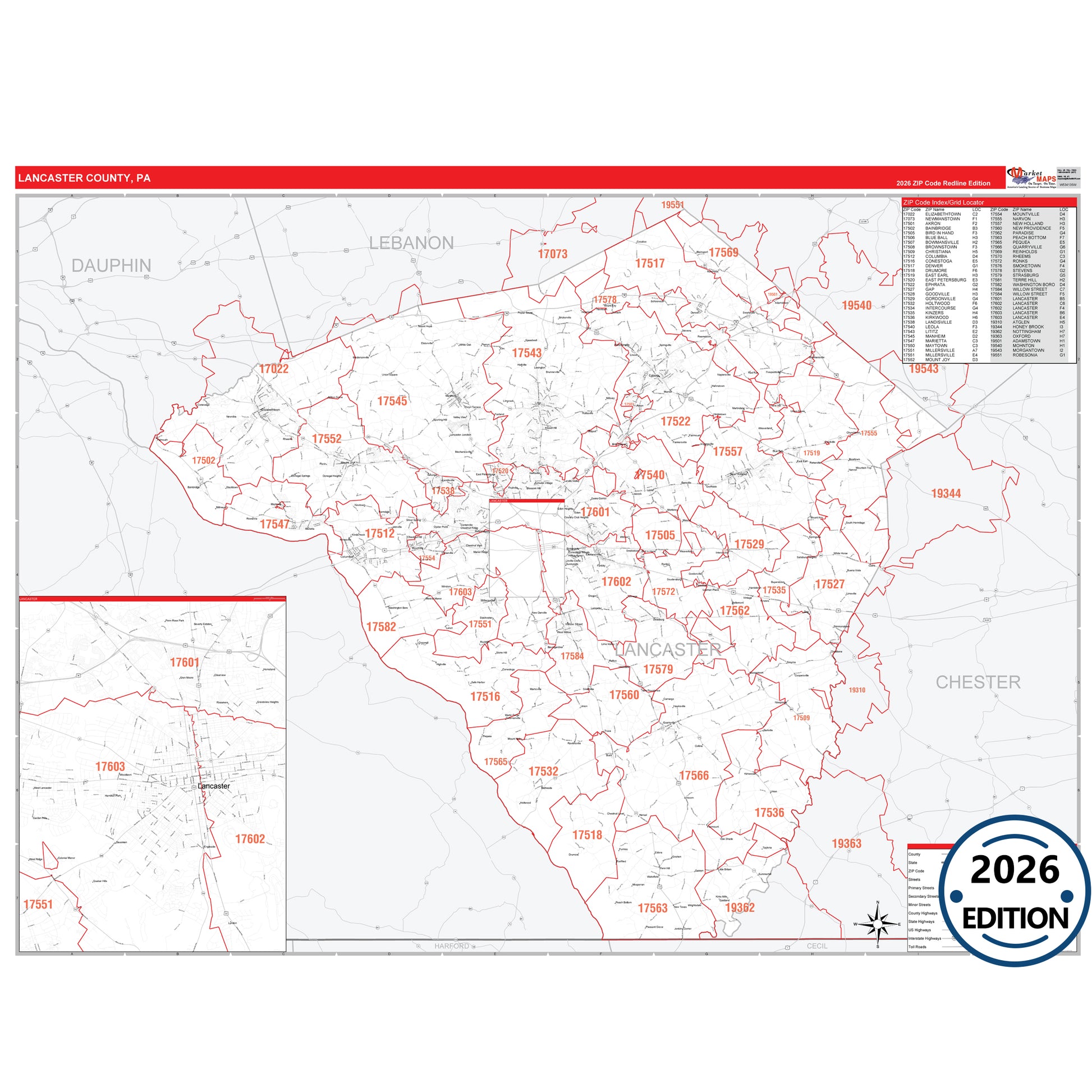 The RedLine Style map of Lancaster County, PA shows ZIP code areas overlaid on a detailed road network of Lancaster County, Pennsylvania. Ideal for drawing locations, territories, and other applications. Base map features include all major streets and highways labeled, cities and towns, county and state boundaries, neighborhood names, railroads, and a clean white background suitable for marking and planning.