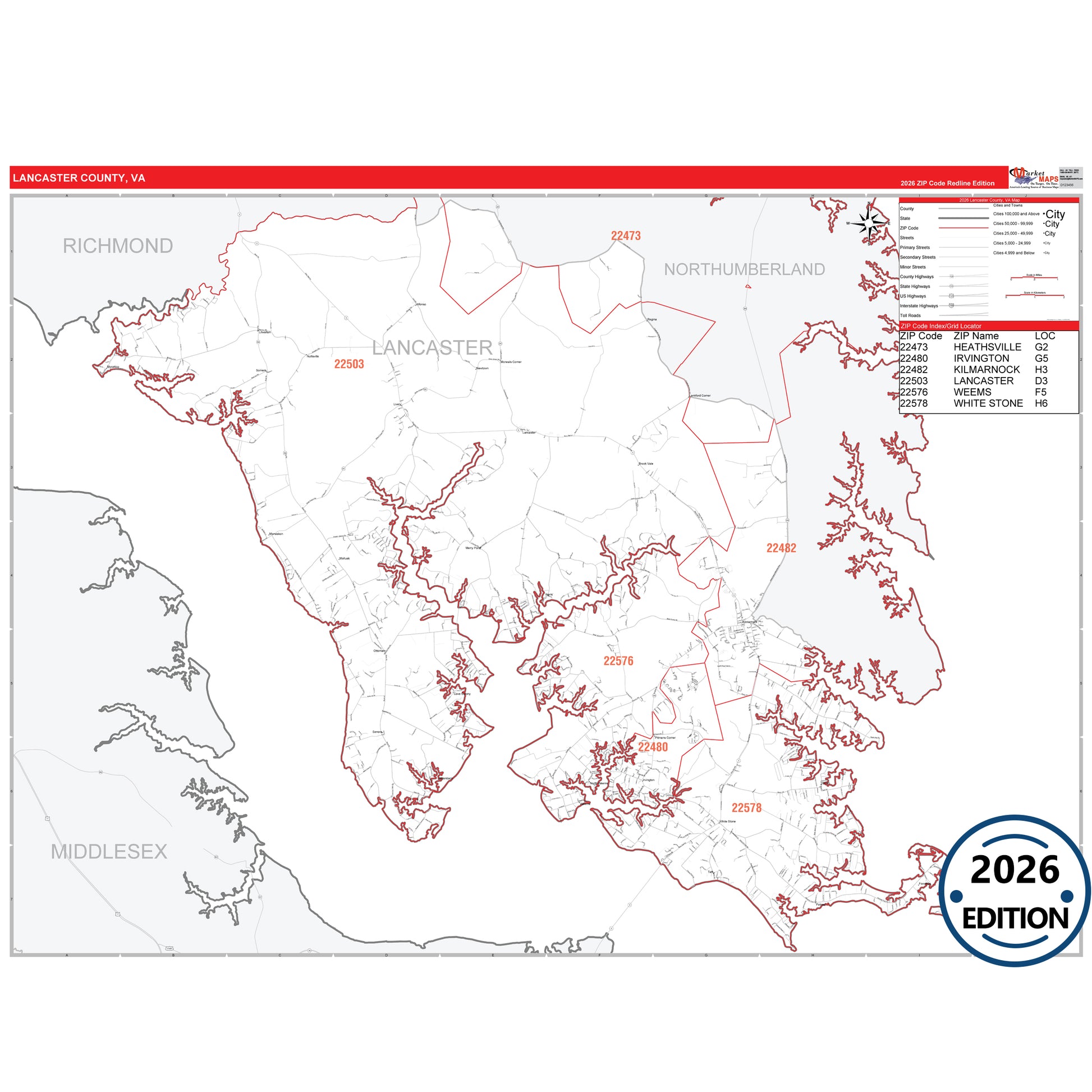The RedLine Style map of Lancaster County, VA shows ZIP code areas overlaid on a detailed road network of Lancaster County, Virginia. Ideal for drawing locations, territories, and other applications. Base map features include all major streets and highways labeled, cities and towns, county and state boundaries, neighborhood names, railroads, and a clean white background suitable for marking and planning.