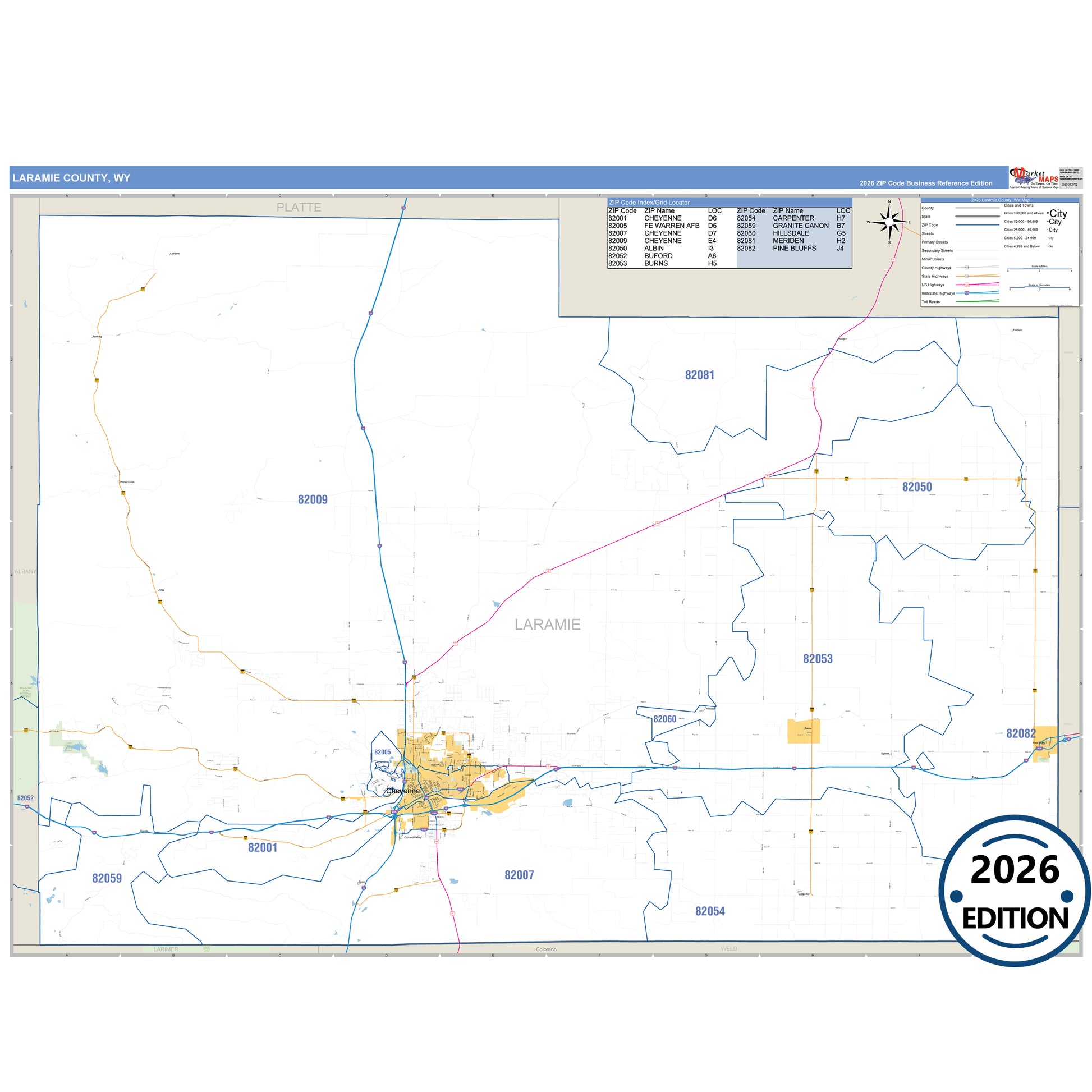 The Business Reference Style Laramie County, WY is a detailed map that includes all towns, cities, major roadways, and highways. Available in multiple wall map sizes, perfect for home, school, office, or business display.