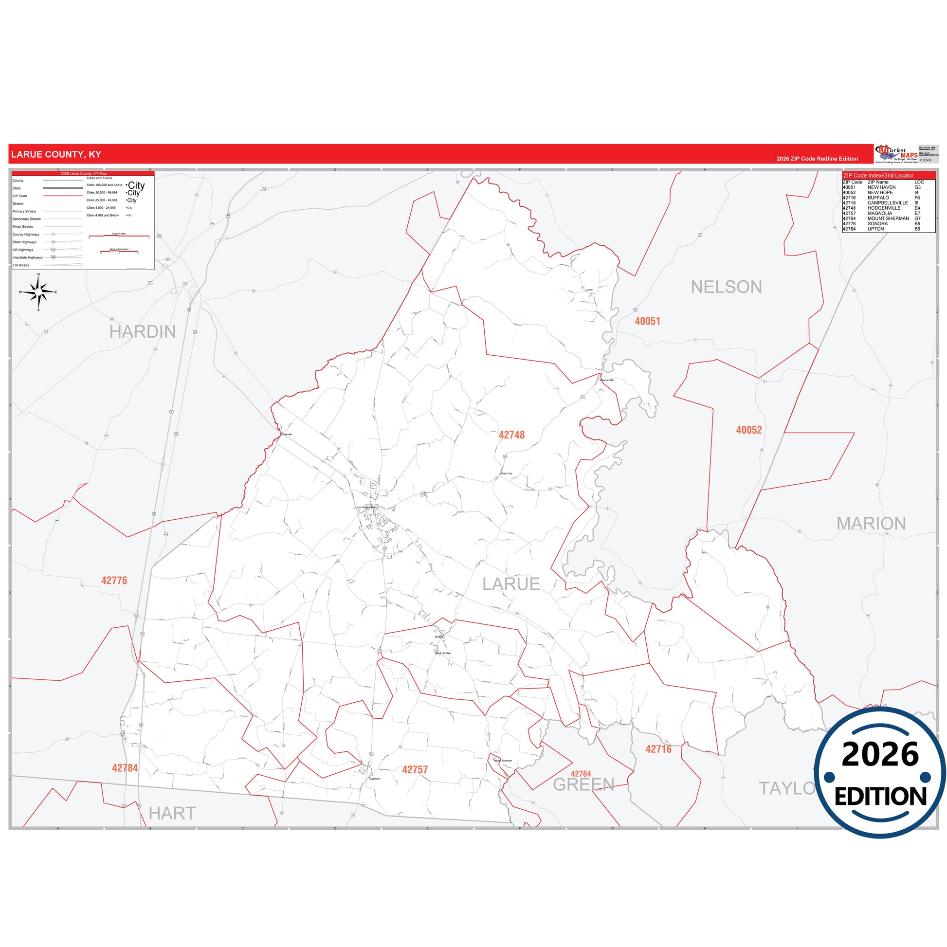 The RedLine Style map of Larue County, KY shows ZIP code areas overlaid on a detailed road network of Larue County, Kentucky. Ideal for drawing locations, territories, and other applications. Base map features include all major streets and highways labeled, cities and towns, county and state boundaries, neighborhood names, railroads, and a clean white background suitable for marking and planning.