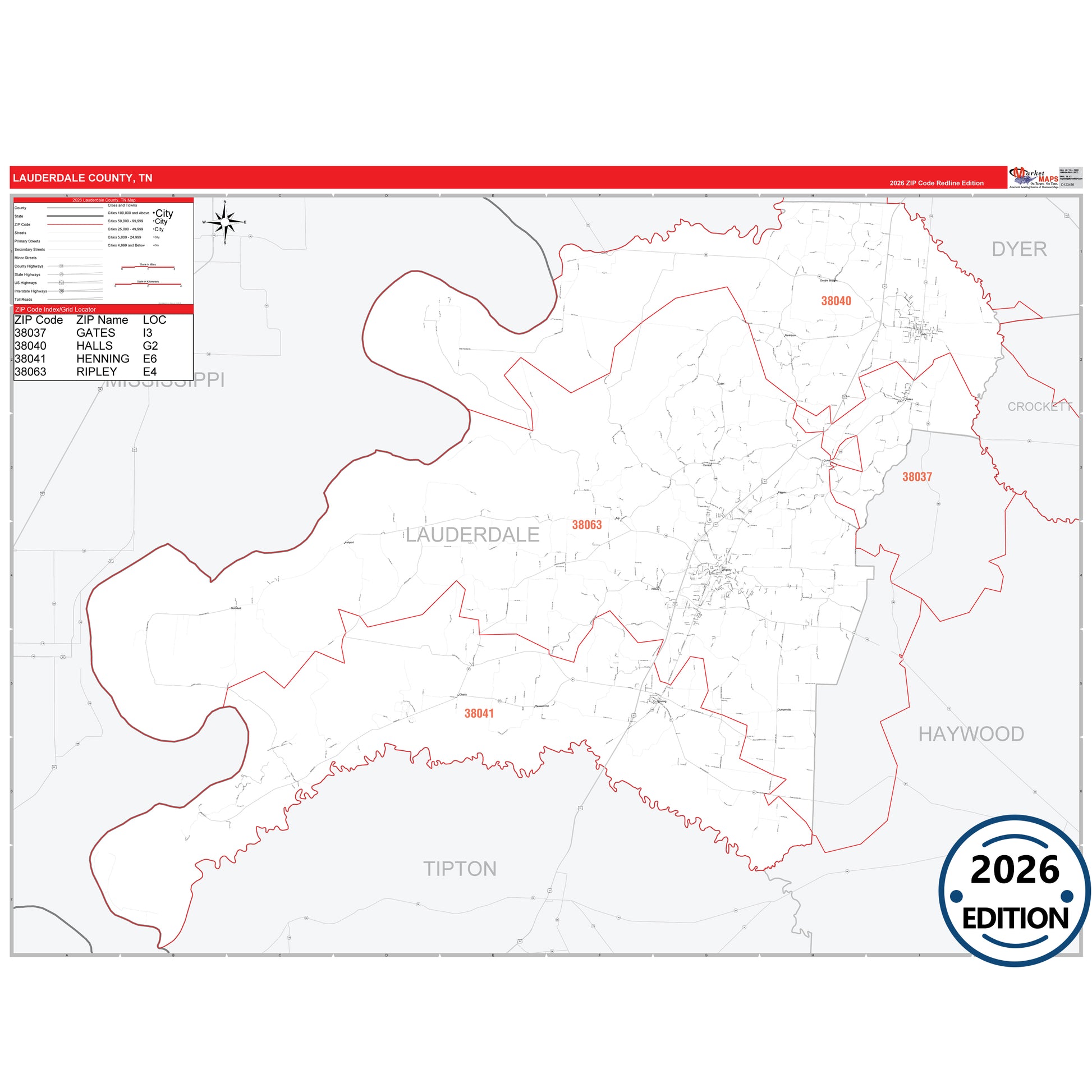 The RedLine Style map of Lauderdale County, TN shows ZIP code areas overlaid on a detailed road network of Lauderdale County, Tennessee. Ideal for drawing locations, territories, and other applications. Base map features include all major streets and highways labeled, cities and towns, county and state boundaries, neighborhood names, railroads, and a clean white background suitable for marking and planning.