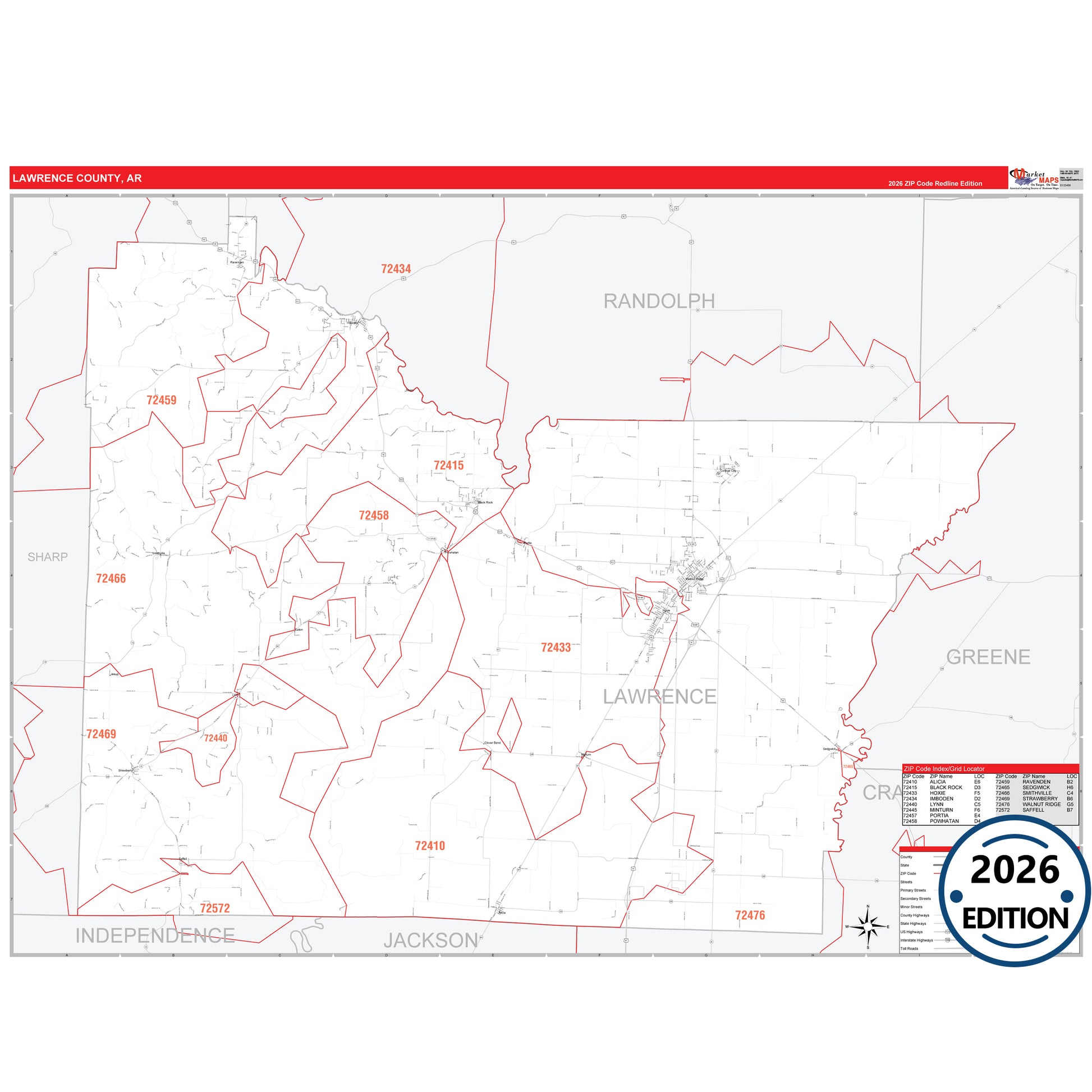 The RedLine Style map of Lawrence County, AR shows ZIP code areas overlaid on a detailed road network of Lawrence County, Arkansas. Ideal for drawing locations, territories, and other applications. Base map features include all major streets and highways labeled, cities and towns, county and state boundaries, neighborhood names, railroads, and a clean white background suitable for marking and planning.