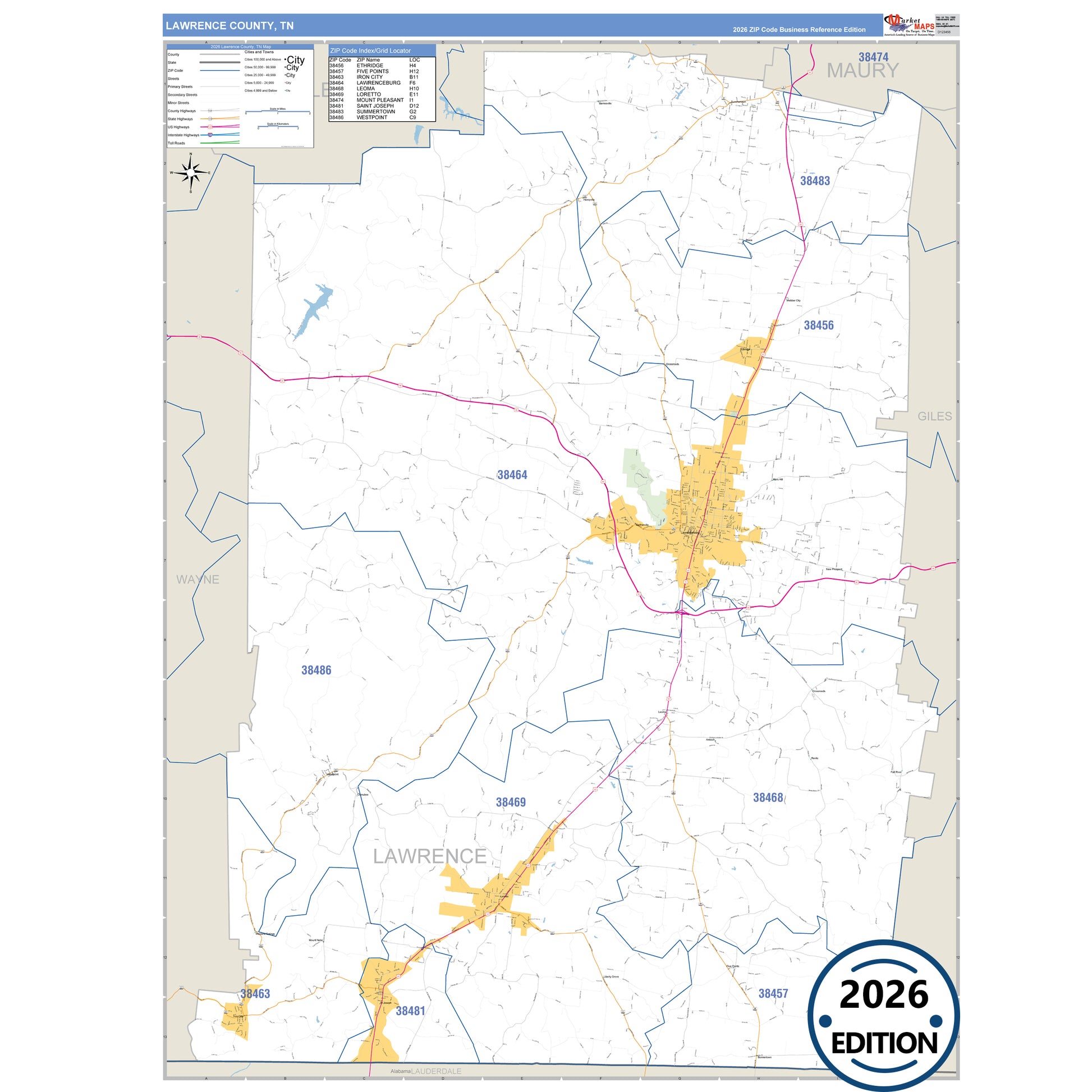 The Business Reference Style Lawrence County, TN is a detailed map that includes all towns, cities, major roadways, and highways. Available in multiple wall map sizes, perfect for home, school, office, or business display.