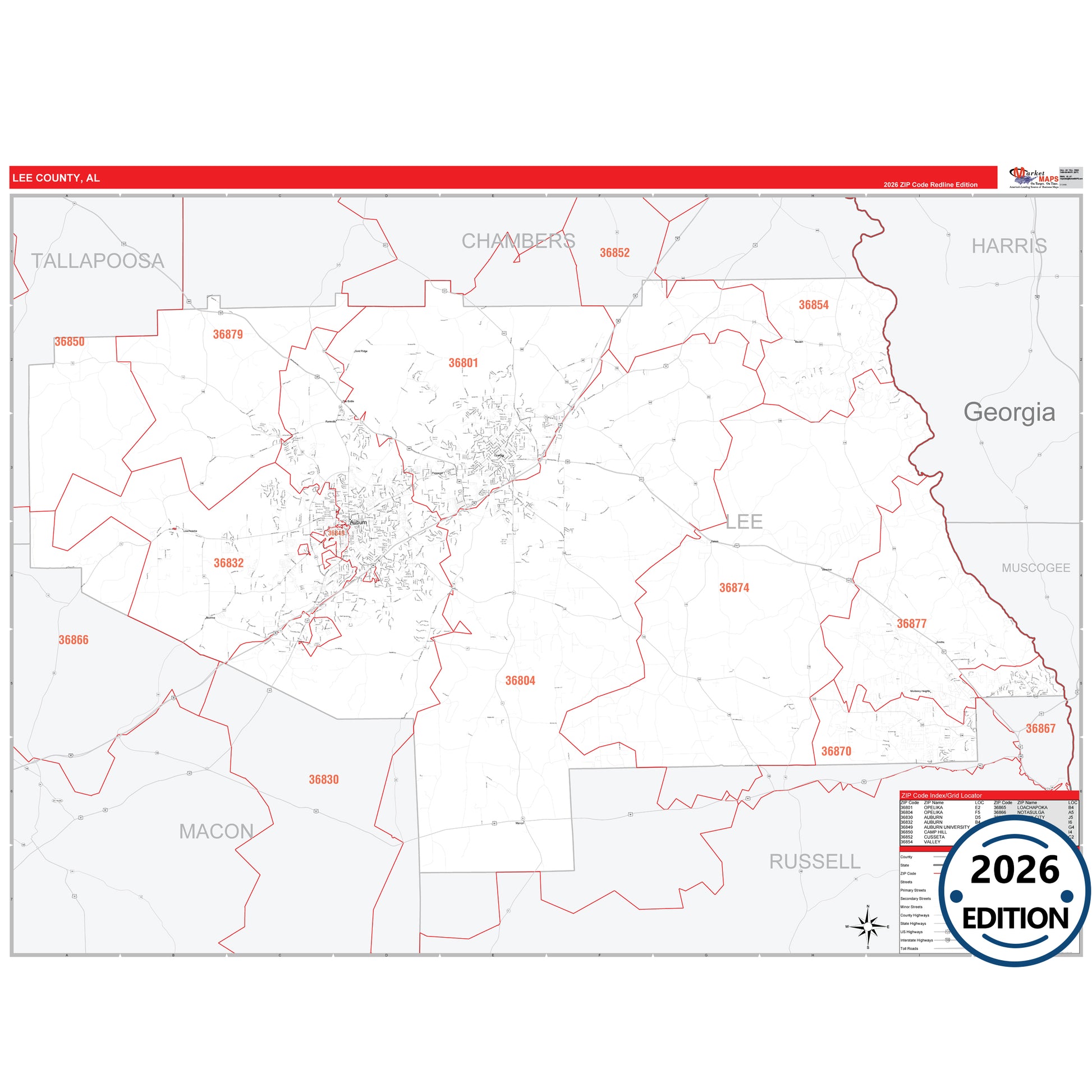 The RedLine Style map of Lee County, AL shows ZIP code areas overlaid on a detailed road network of Lee County, Alabama. Ideal for drawing locations, territories, and other applications. Base map features include all major streets and highways labeled, cities and towns, county and state boundaries, neighborhood names, railroads, and a clean white background suitable for marking and planning.