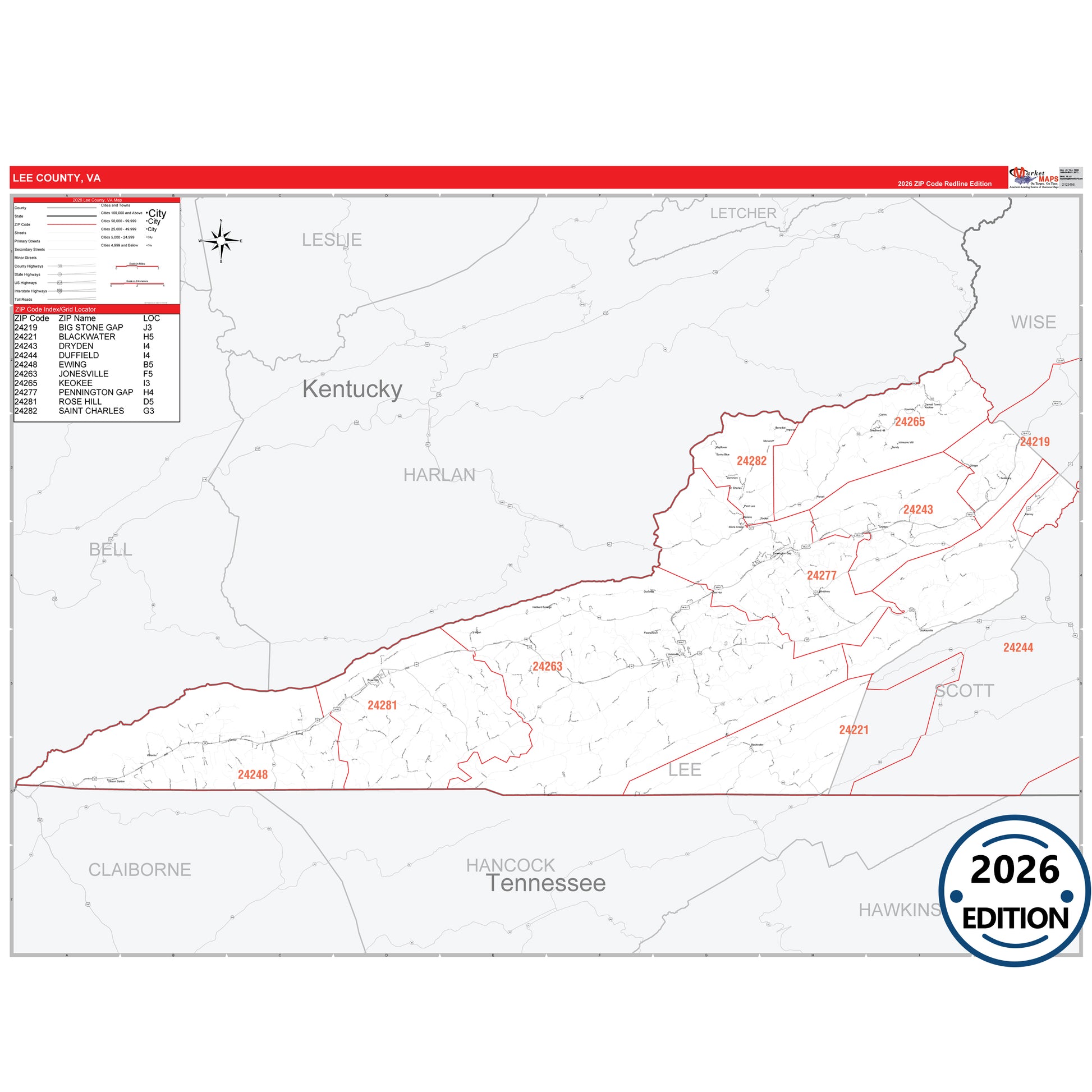 The RedLine Style map of Lee County, VA shows ZIP code areas overlaid on a detailed road network of Lee County, Virginia. Ideal for drawing locations, territories, and other applications. Base map features include all major streets and highways labeled, cities and towns, county and state boundaries, neighborhood names, railroads, and a clean white background suitable for marking and planning.