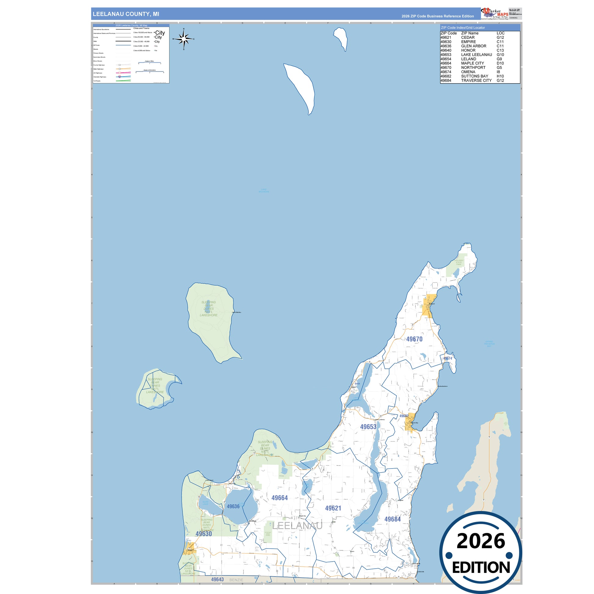 The Business Reference Style Leelanau County, MI is a detailed map that includes all towns, cities, major roadways, and highways. Available in multiple wall map sizes, perfect for home, school, office, or business display.