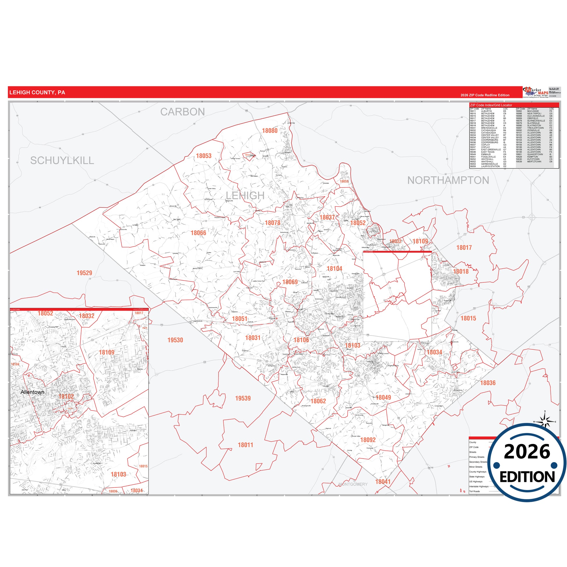 The RedLine Style map of Lehigh County, PA shows ZIP code areas overlaid on a detailed road network of Lehigh County, Pennsylvania. Ideal for drawing locations, territories, and other applications. Base map features include all major streets and highways labeled, cities and towns, county and state boundaries, neighborhood names, railroads, and a clean white background suitable for marking and planning.