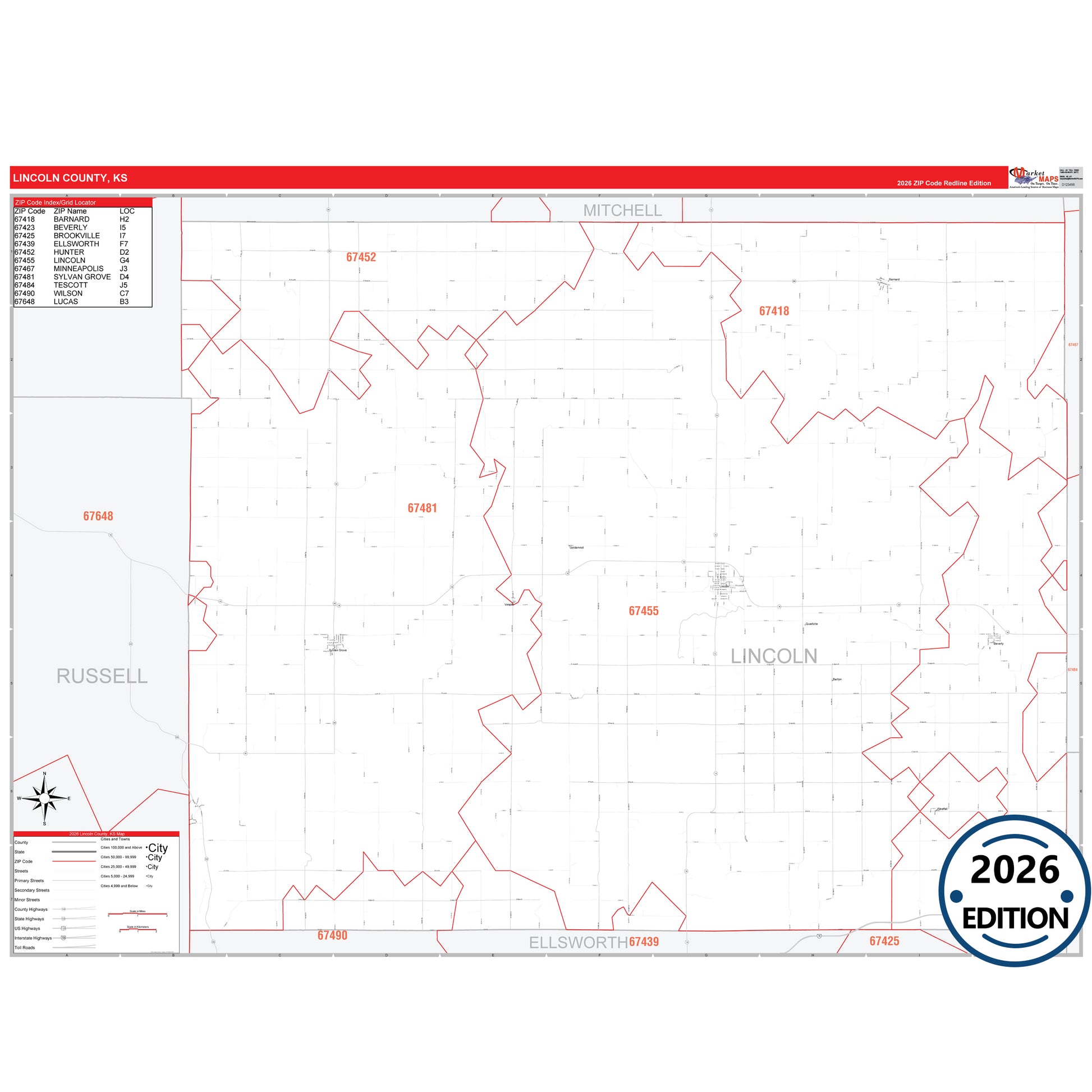 The RedLine Style map of Lincoln County, KS shows ZIP code areas overlaid on a detailed road network of Lincoln County, Kansas. Ideal for drawing locations, territories, and other applications. Base map features include all major streets and highways labeled, cities and towns, county and state boundaries, neighborhood names, railroads, and a clean white background suitable for marking and planning.
