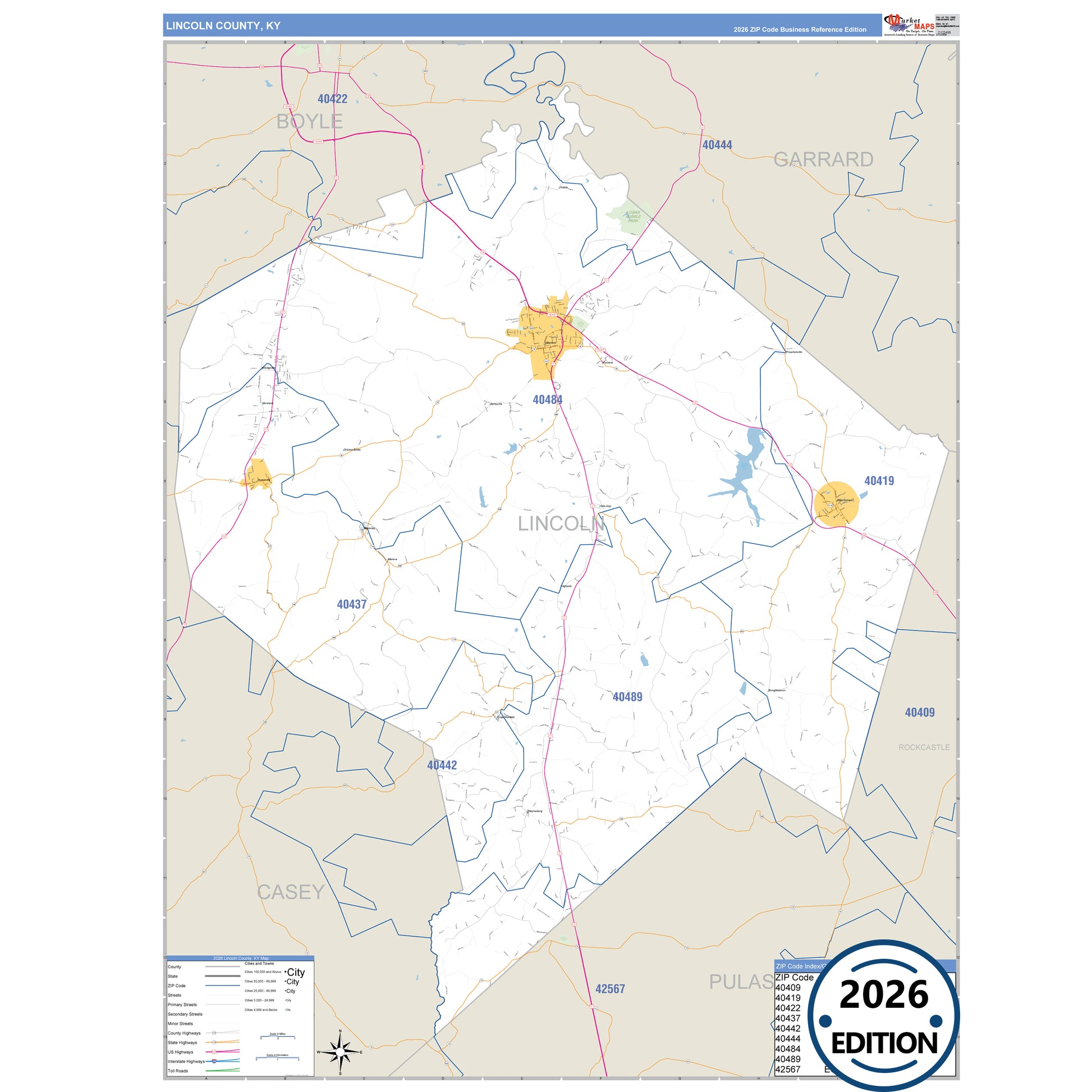 The Business Reference Style Lincoln County, KY is a detailed map that includes all towns, cities, major roadways, and highways. Available in multiple wall map sizes, perfect for home, school, office, or business display.