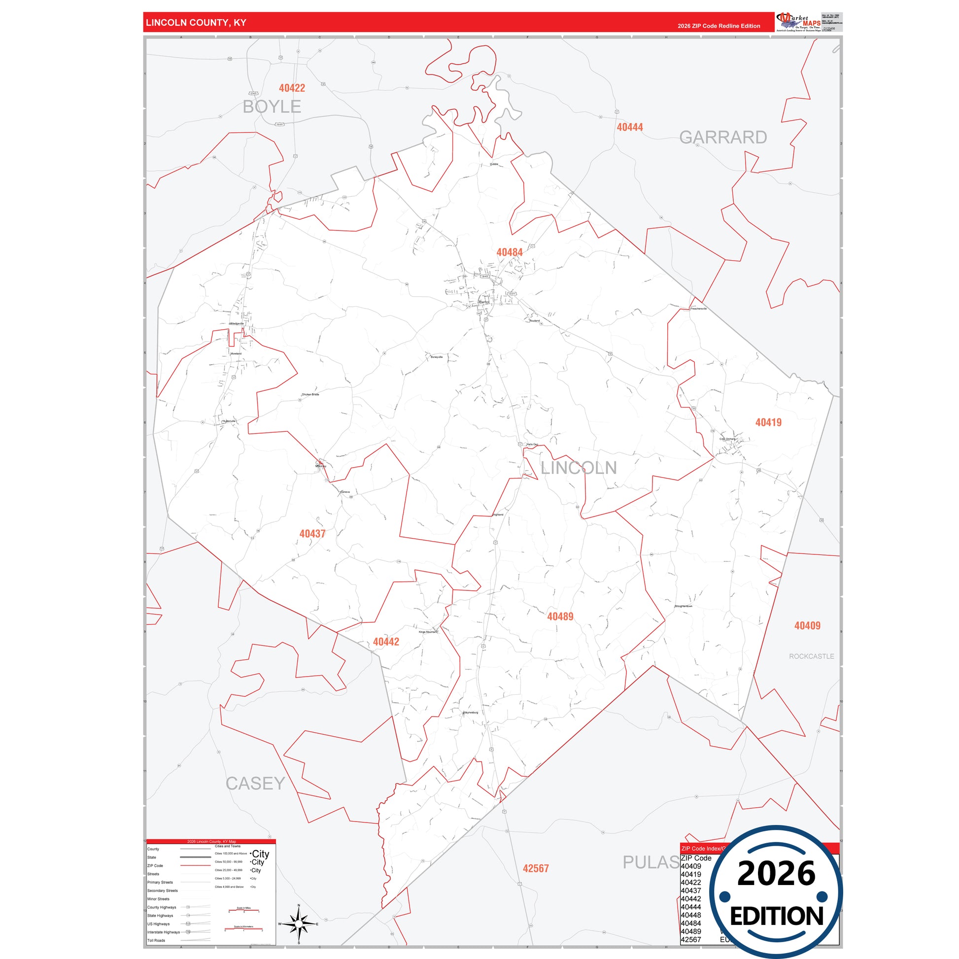 The RedLine Style map of Lincoln County, KY shows ZIP code areas overlaid on a detailed road network of Lincoln County, Kentucky. Ideal for drawing locations, territories, and other applications. Base map features include all major streets and highways labeled, cities and towns, county and state boundaries, neighborhood names, railroads, and a clean white background suitable for marking and planning.