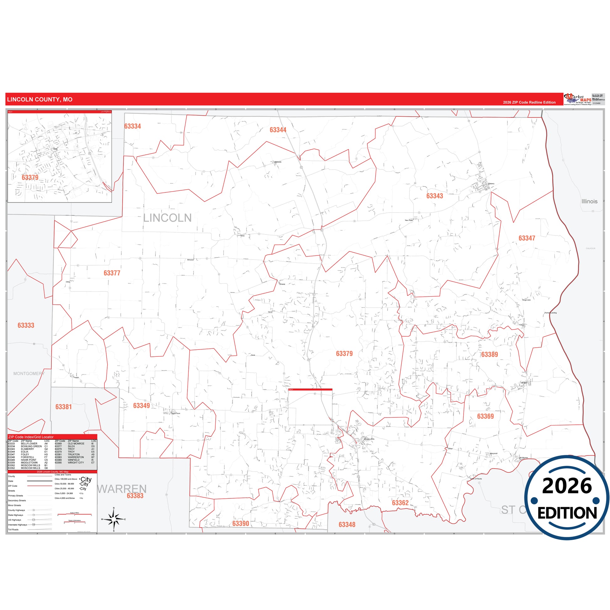 The RedLine Style map of Lincoln County, MO shows ZIP code areas overlaid on a detailed road network of Lincoln County, Missouri. Ideal for drawing locations, territories, and other applications. Base map features include all major streets and highways labeled, cities and towns, county and state boundaries, neighborhood names, railroads, and a clean white background suitable for marking and planning.