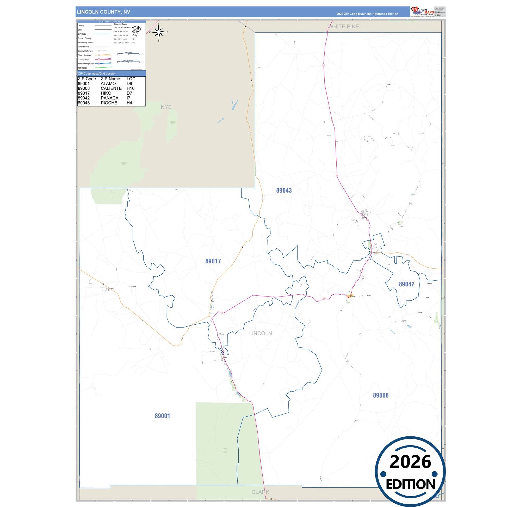 The Business Reference Style Lincoln County, NV is a detailed map that includes all towns, cities, major roadways, and highways. Available in multiple wall map sizes, perfect for home, school, office, or business display.