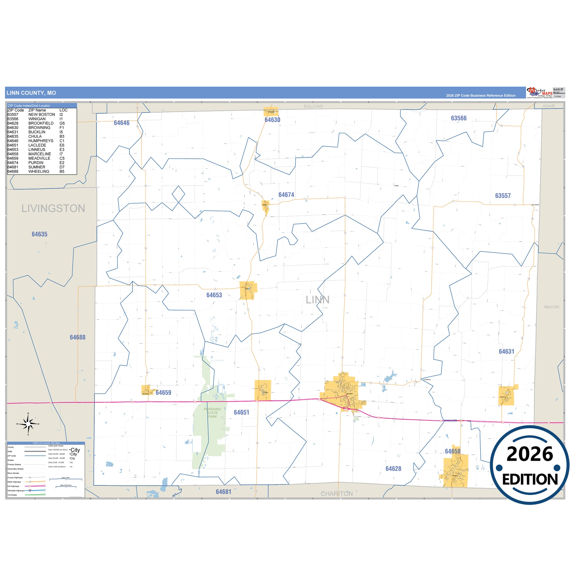 The Business Reference Style Linn County, MO is a detailed map that includes all towns, cities, major roadways, and highways. Available in multiple wall map sizes, perfect for home, school, office, or business display.