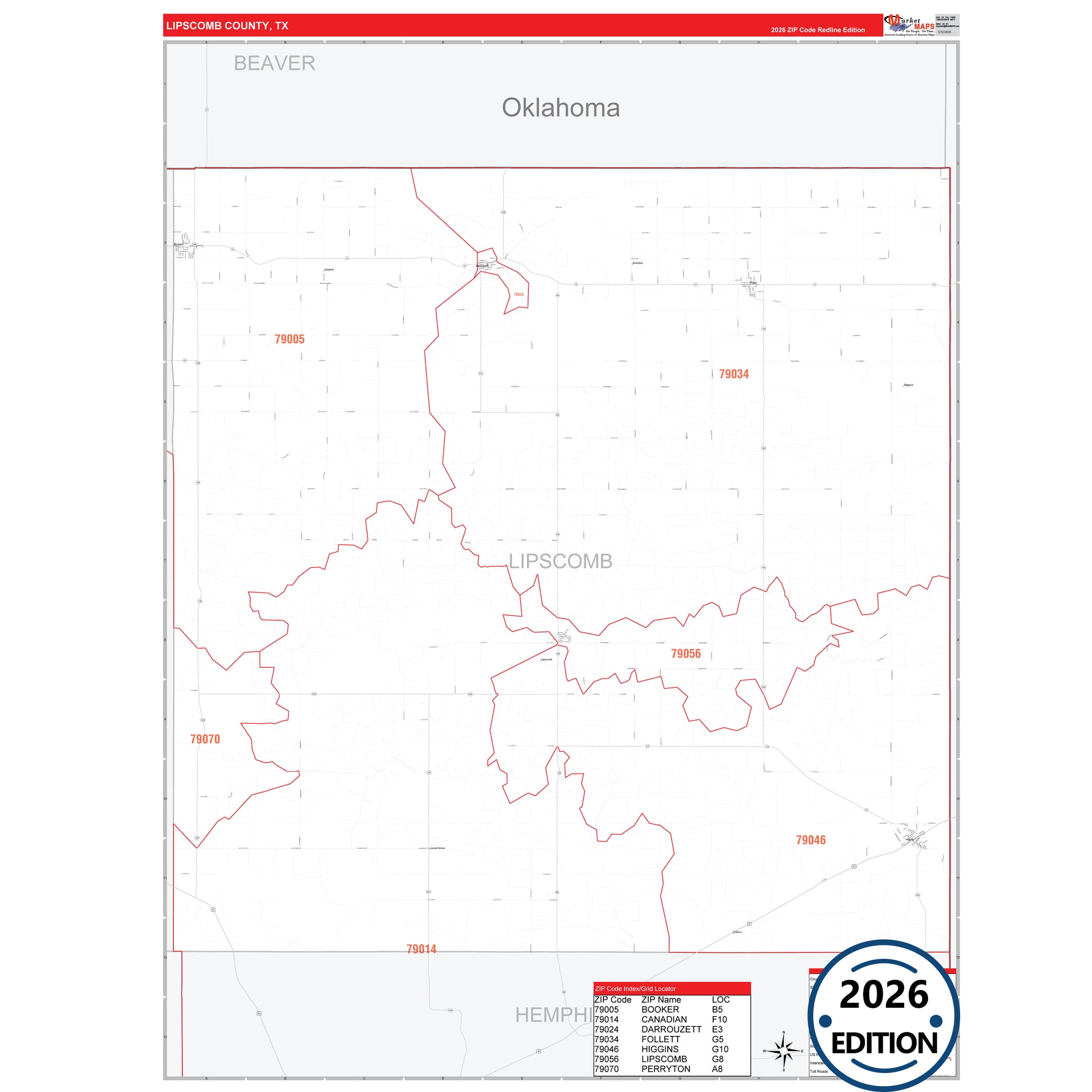 The RedLine Style map of Lipscomb County, TX shows ZIP code areas overlaid on a detailed road network of Lipscomb County, Texas. Ideal for drawing locations, territories, and other applications. Base map features include all major streets and highways labeled, cities and towns, county and state boundaries, neighborhood names, railroads, and a clean white background suitable for marking and planning.