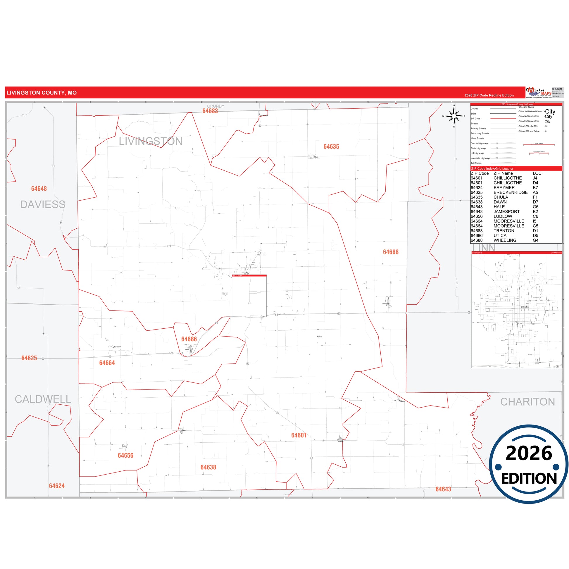 The RedLine Style map of Livingston County, MO shows ZIP code areas overlaid on a detailed road network of Livingston County, Missouri. Ideal for drawing locations, territories, and other applications. Base map features include all major streets and highways labeled, cities and towns, county and state boundaries, neighborhood names, railroads, and a clean white background suitable for marking and planning.