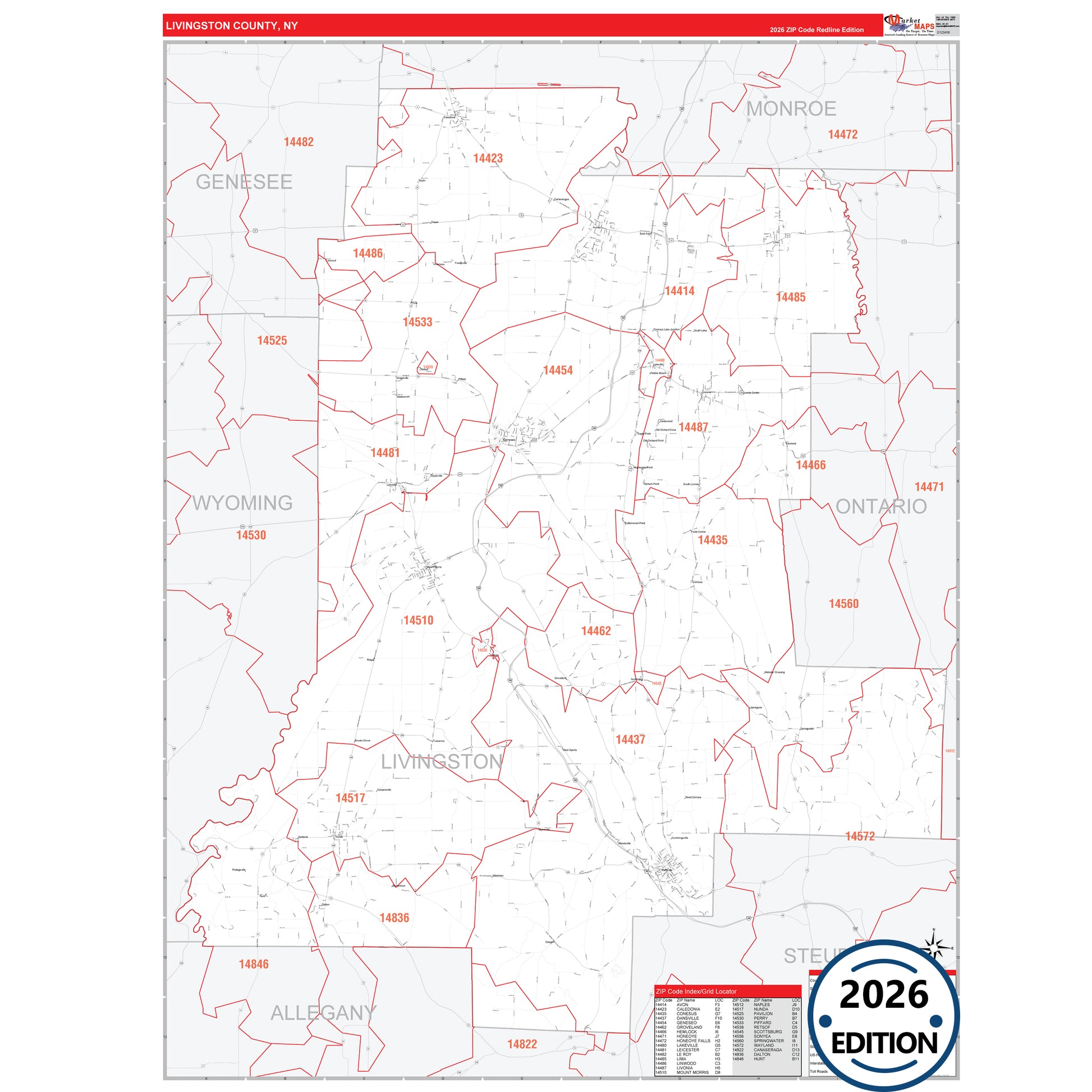 The RedLine Style map of Livingston County, NY shows ZIP code areas overlaid on a detailed road network of Livingston County, New York. Ideal for drawing locations, territories, and other applications. Base map features include all major streets and highways labeled, cities and towns, county and state boundaries, neighborhood names, railroads, and a clean white background suitable for marking and planning.