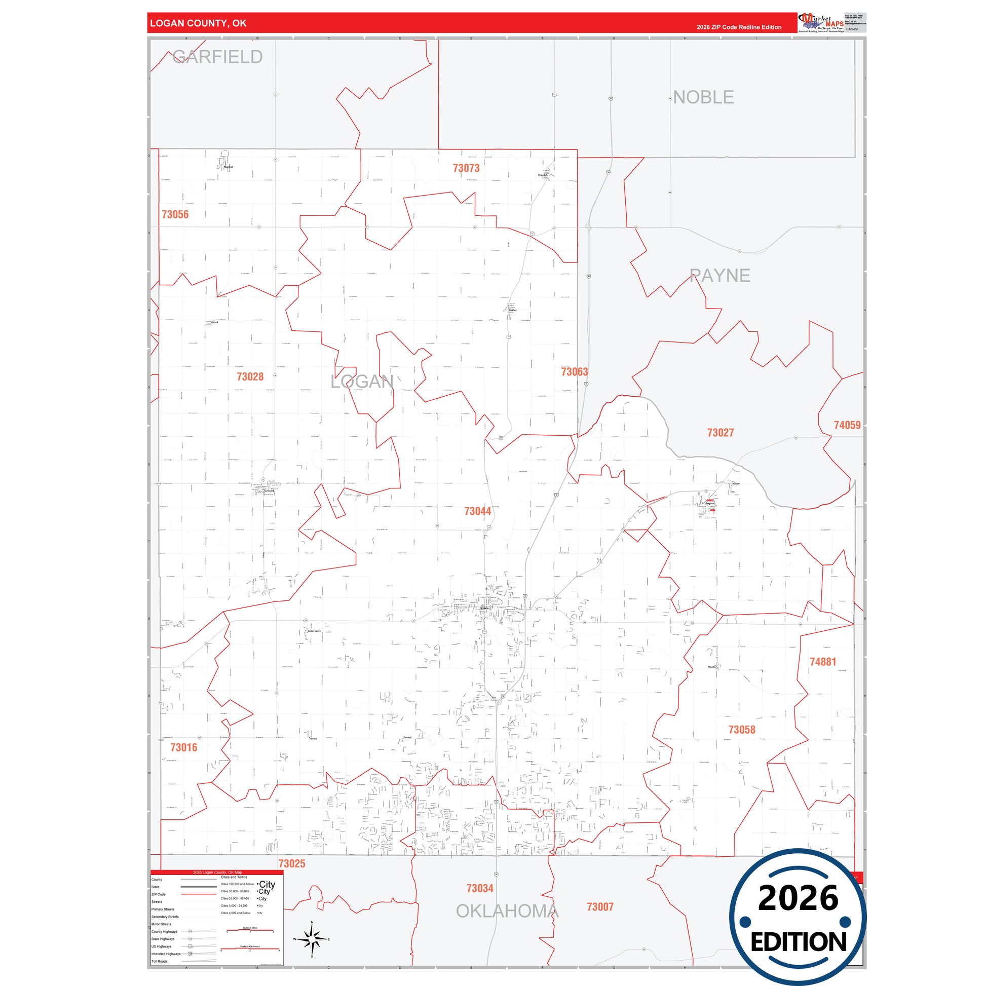 The RedLine Style map of Logan County, OK shows ZIP code areas overlaid on a detailed road network of Logan County, Oklahoma. Ideal for drawing locations, territories, and other applications. Base map features include all major streets and highways labeled, cities and towns, county and state boundaries, neighborhood names, railroads, and a clean white background suitable for marking and planning.