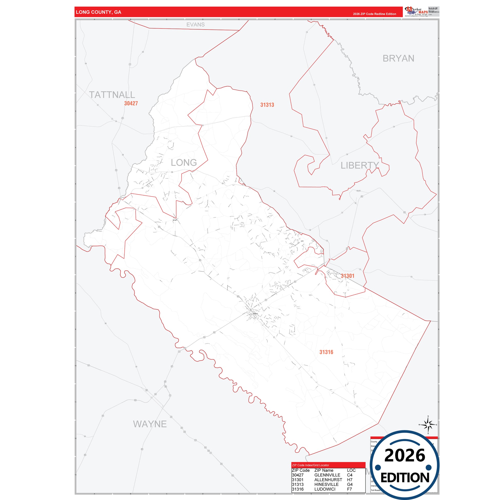 The RedLine Style map of Long County, GA shows ZIP code areas overlaid on a detailed road network of Long County, Georgia. Ideal for drawing locations, territories, and other applications. Base map features include all major streets and highways labeled, cities and towns, county and state boundaries, neighborhood names, railroads, and a clean white background suitable for marking and planning.