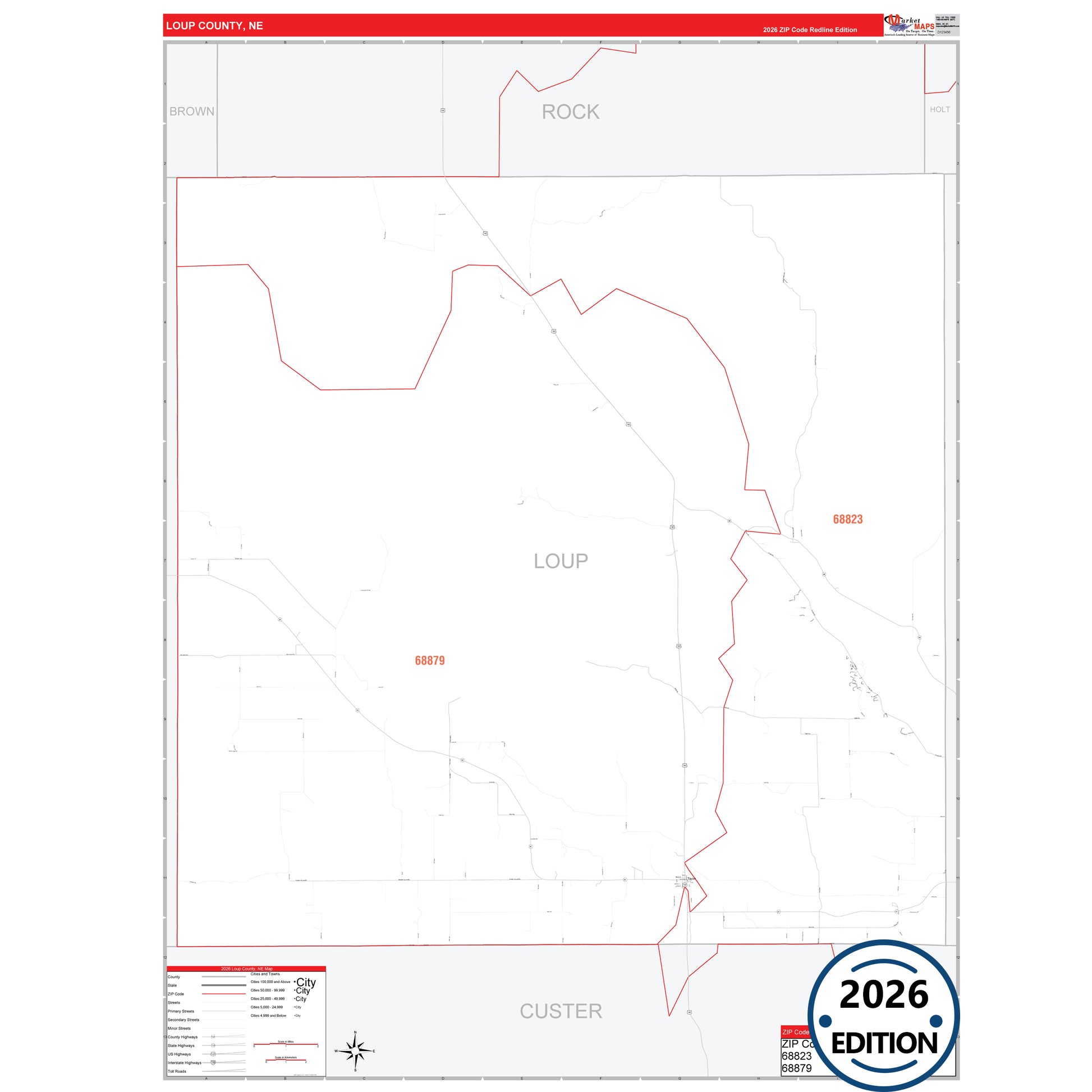 The RedLine Style map of Loup County, NE shows ZIP code areas overlaid on a detailed road network of Loup County, Nebraska. Ideal for drawing locations, territories, and other applications. Base map features include all major streets and highways labeled, cities and towns, county and state boundaries, neighborhood names, railroads, and a clean white background suitable for marking and planning.