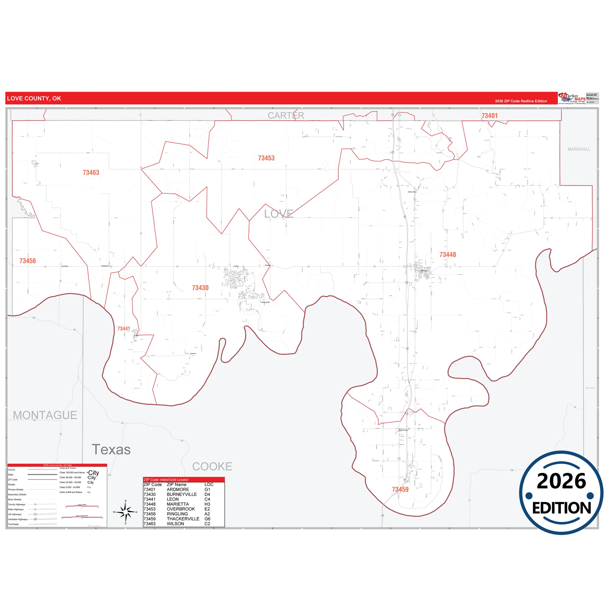 The RedLine Style map of Love County, OK shows ZIP code areas overlaid on a detailed road network of Love County, Oklahoma. Ideal for drawing locations, territories, and other applications. Base map features include all major streets and highways labeled, cities and towns, county and state boundaries, neighborhood names, railroads, and a clean white background suitable for marking and planning.