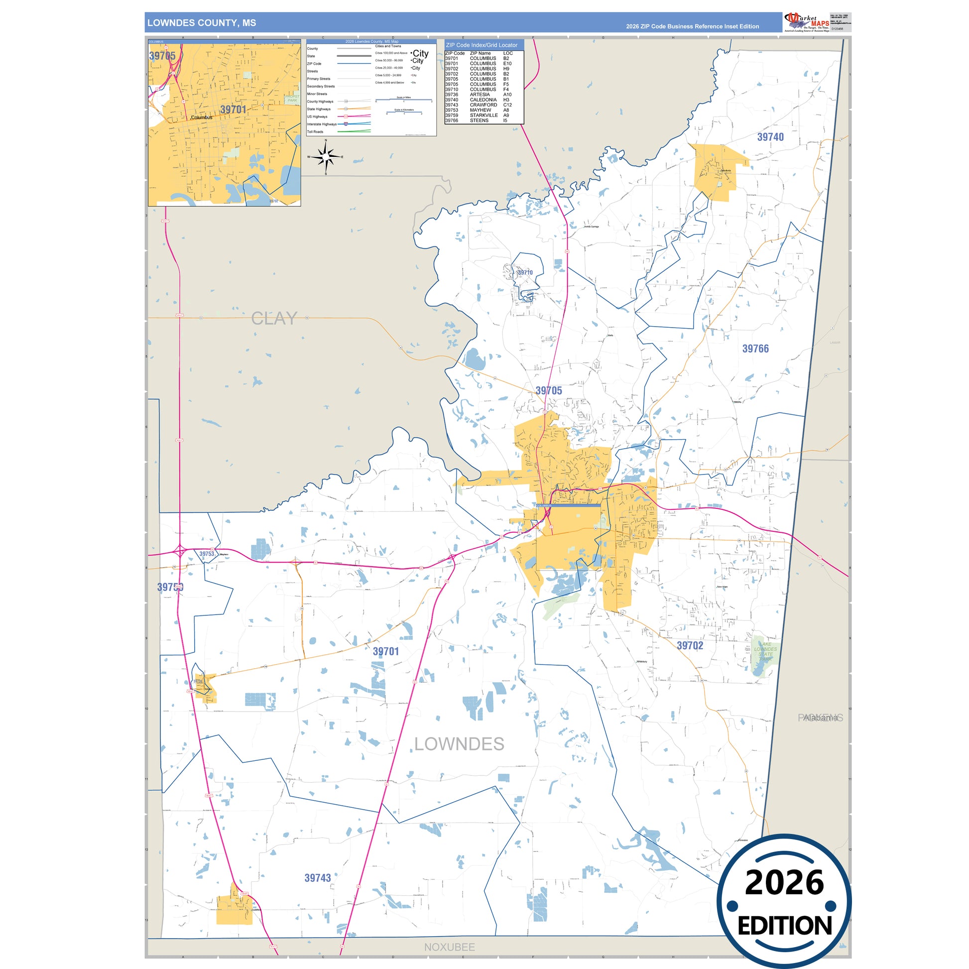 The Business Reference Style Lowndes County, MS is a detailed map that includes all towns, cities, major roadways, and highways. Available in multiple wall map sizes, perfect for home, school, office, or business display.