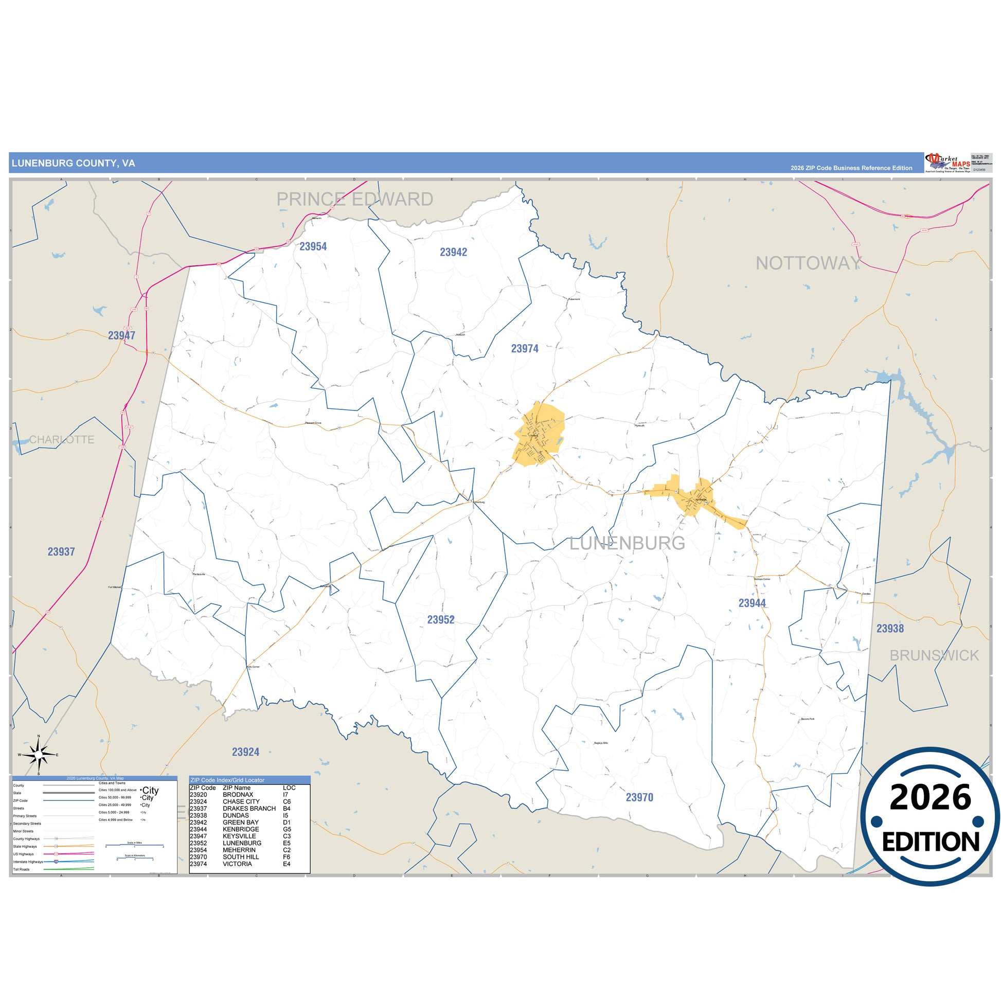 The Business Reference Style Lunenburg County, VA is a detailed map that includes all towns, cities, major roadways, and highways. Available in multiple wall map sizes, perfect for home, school, office, or business display.
