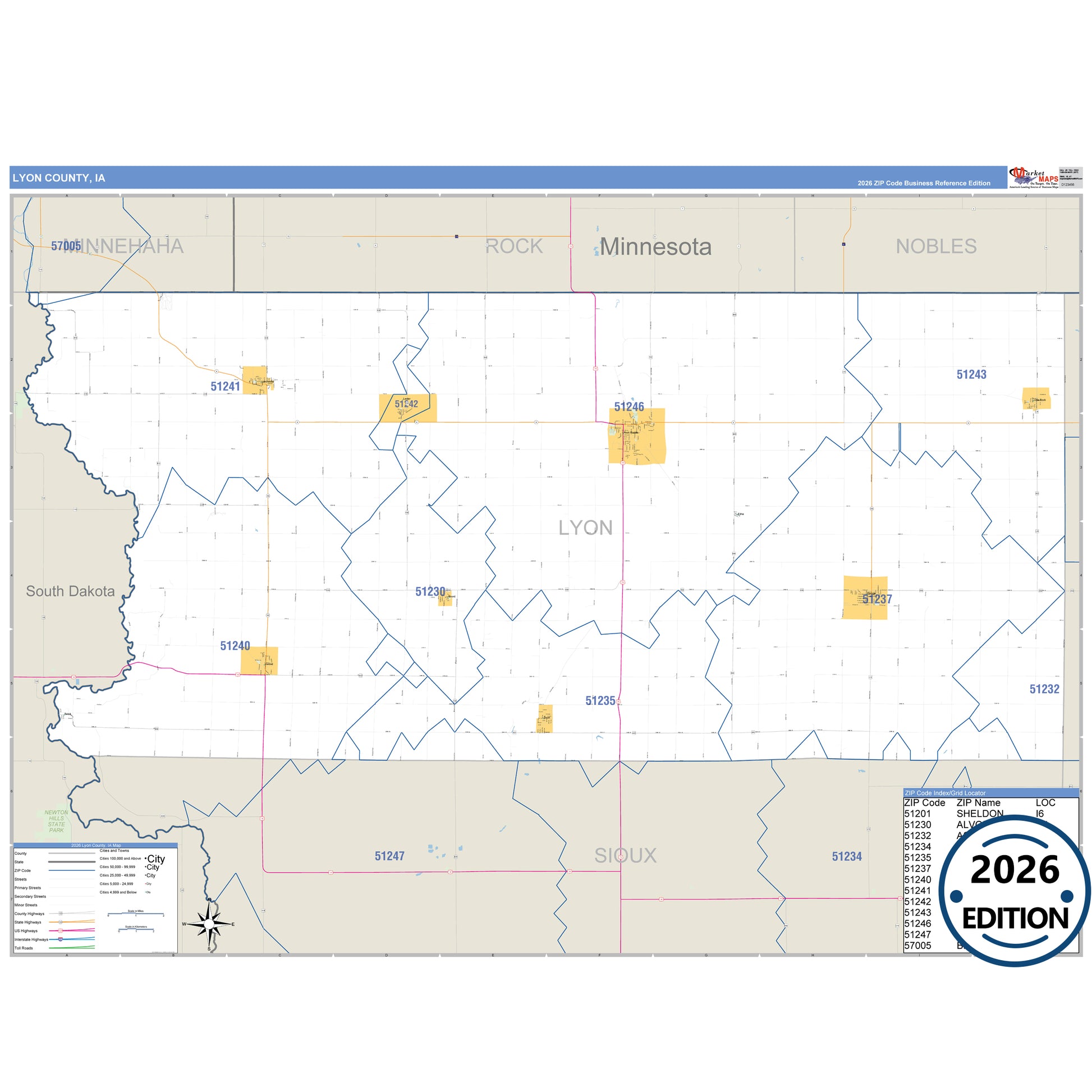 The Business Reference Style Lyon County, IA is a detailed map that includes all towns, cities, major roadways, and highways. Available in multiple wall map sizes, perfect for home, school, office, or business display.