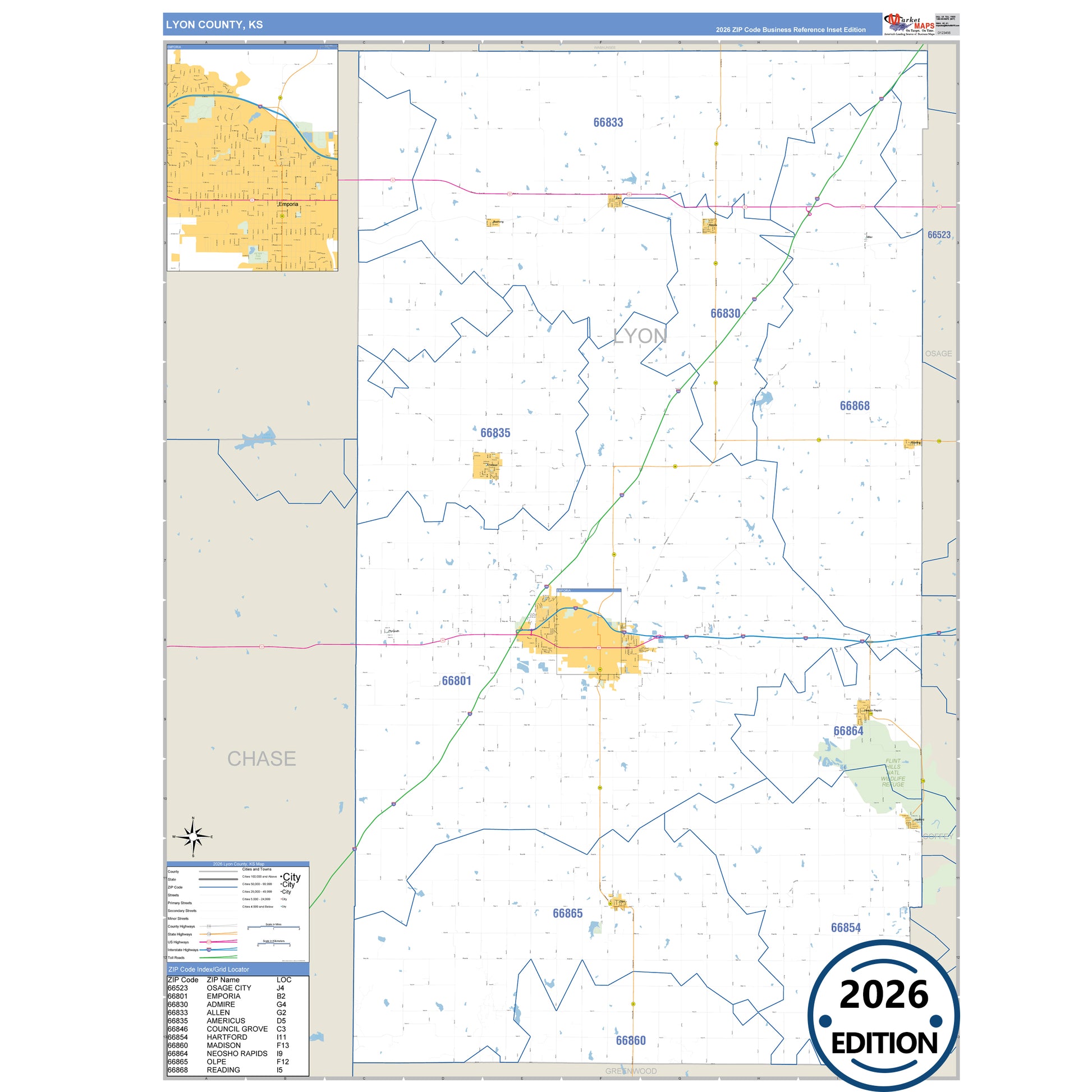 The Business Reference Style Lyon County, KS is a detailed map that includes all towns, cities, major roadways, and highways. Available in multiple wall map sizes, perfect for home, school, office, or business display.