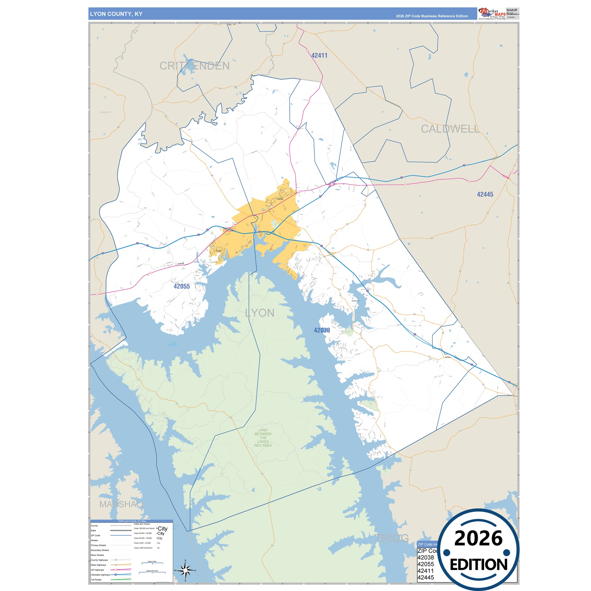 The Business Reference Style Lyon County, KY is a detailed map that includes all towns, cities, major roadways, and highways. Available in multiple wall map sizes, perfect for home, school, office, or business display.