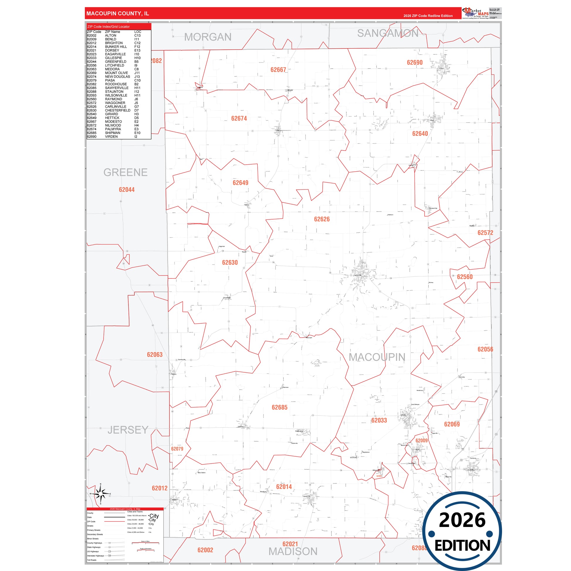 The RedLine Style map of Macoupin County, IL shows ZIP code areas overlaid on a detailed road network of Macoupin County, Illinois. Ideal for drawing locations, territories, and other applications. Base map features include all major streets and highways labeled, cities and towns, county and state boundaries, neighborhood names, railroads, and a clean white background suitable for marking and planning.