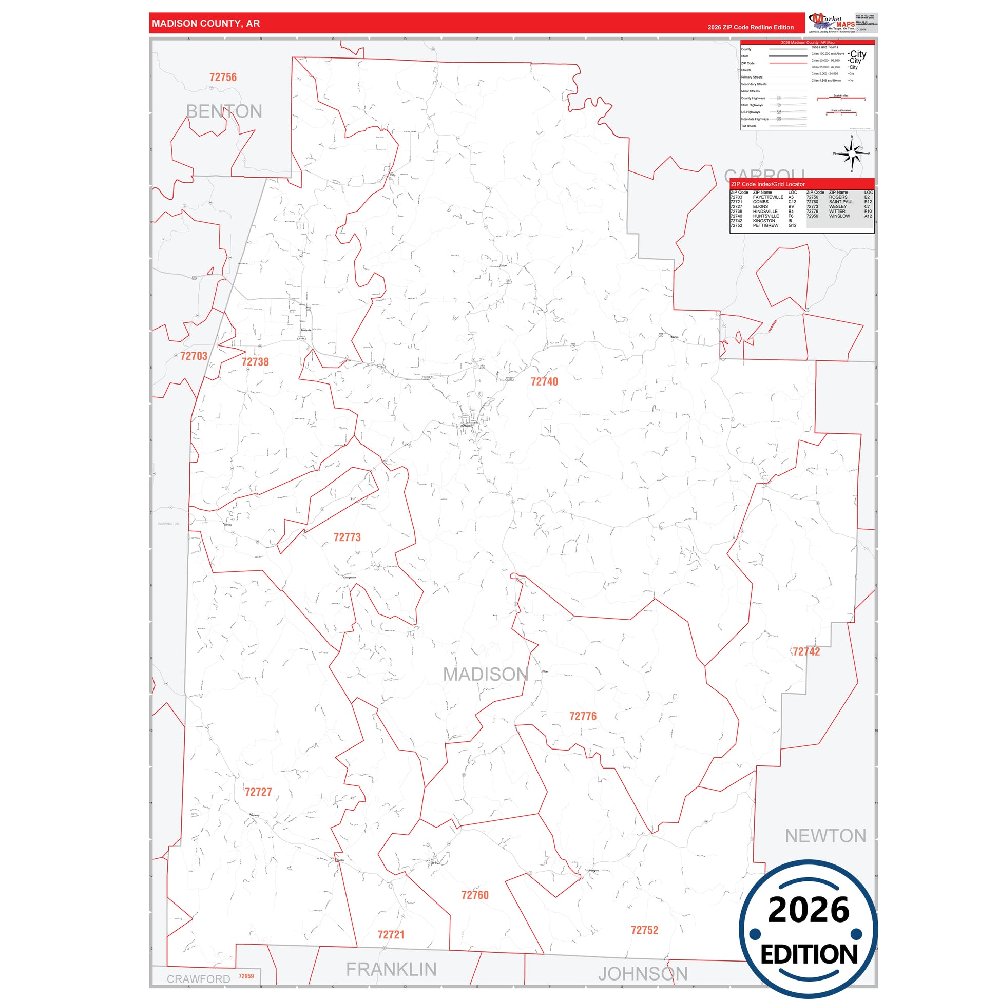 The RedLine Style map of Madison County, AR shows ZIP code areas overlaid on a detailed road network of Madison County, Arkansas. Ideal for drawing locations, territories, and other applications. Base map features include all major streets and highways labeled, cities and towns, county and state boundaries, neighborhood names, railroads, and a clean white background suitable for marking and planning.