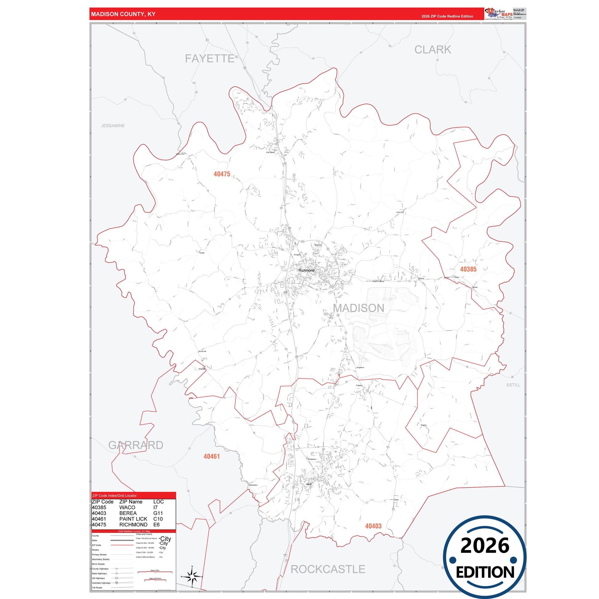 The RedLine Style map of Madison County, KY shows ZIP code areas overlaid on a detailed road network of Madison County, Kentucky. Ideal for drawing locations, territories, and other applications. Base map features include all major streets and highways labeled, cities and towns, county and state boundaries, neighborhood names, railroads, and a clean white background suitable for marking and planning.