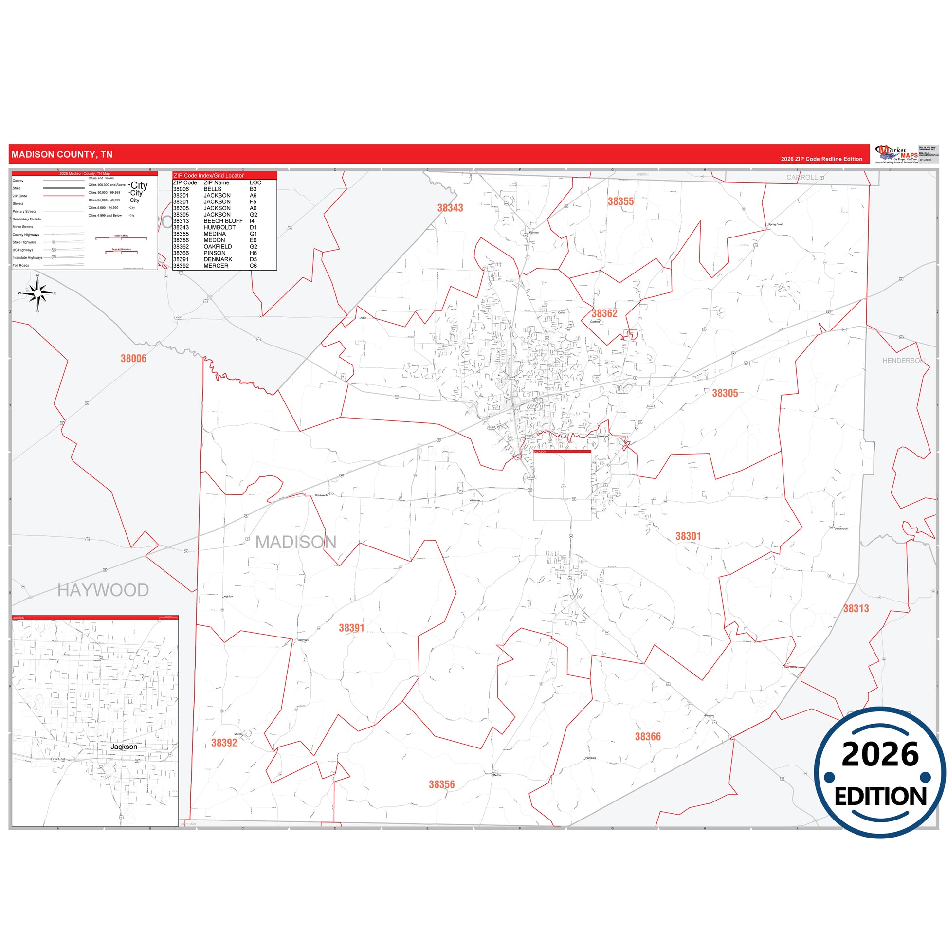 The RedLine Style map of Madison County, TN shows ZIP code areas overlaid on a detailed road network of Madison County, Tennessee. Ideal for drawing locations, territories, and other applications. Base map features include all major streets and highways labeled, cities and towns, county and state boundaries, neighborhood names, railroads, and a clean white background suitable for marking and planning.