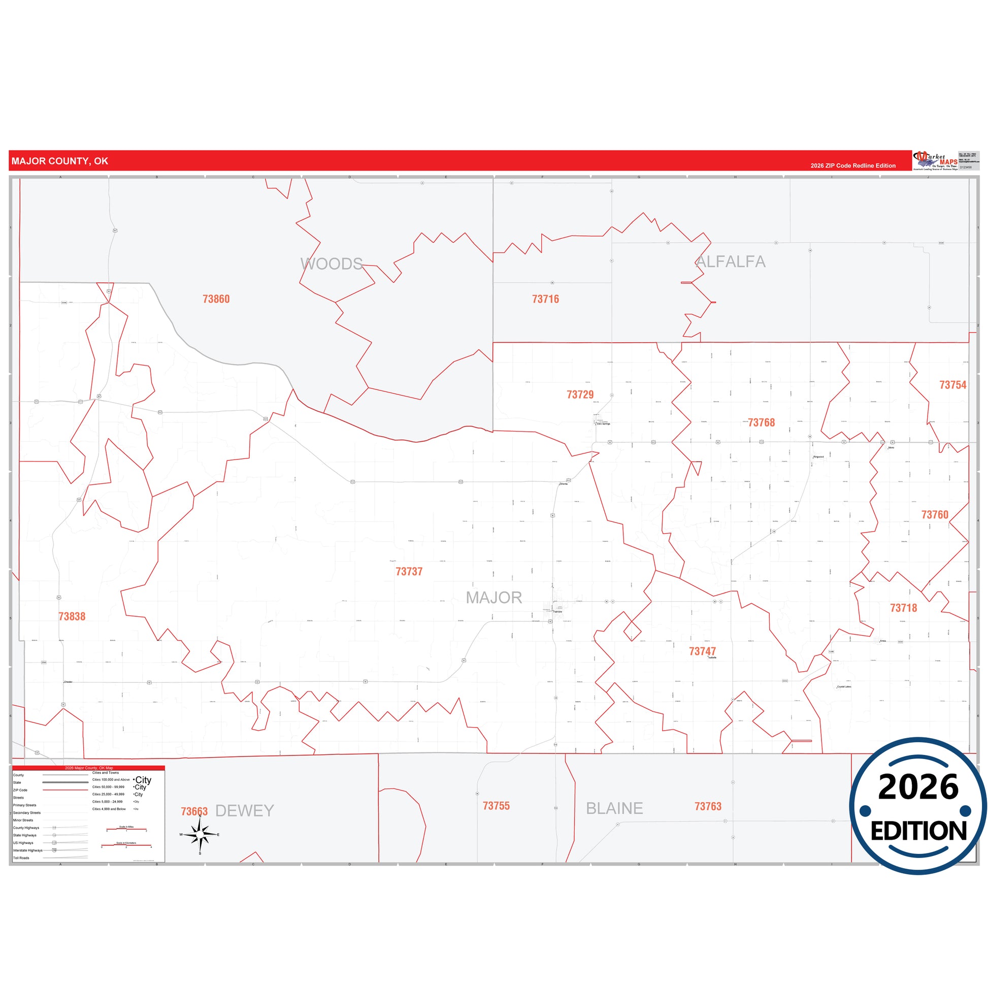 The RedLine Style map of Major County, OK shows ZIP code areas overlaid on a detailed road network of Major County, Oklahoma. Ideal for drawing locations, territories, and other applications. Base map features include all major streets and highways labeled, cities and towns, county and state boundaries, neighborhood names, railroads, and a clean white background suitable for marking and planning.
