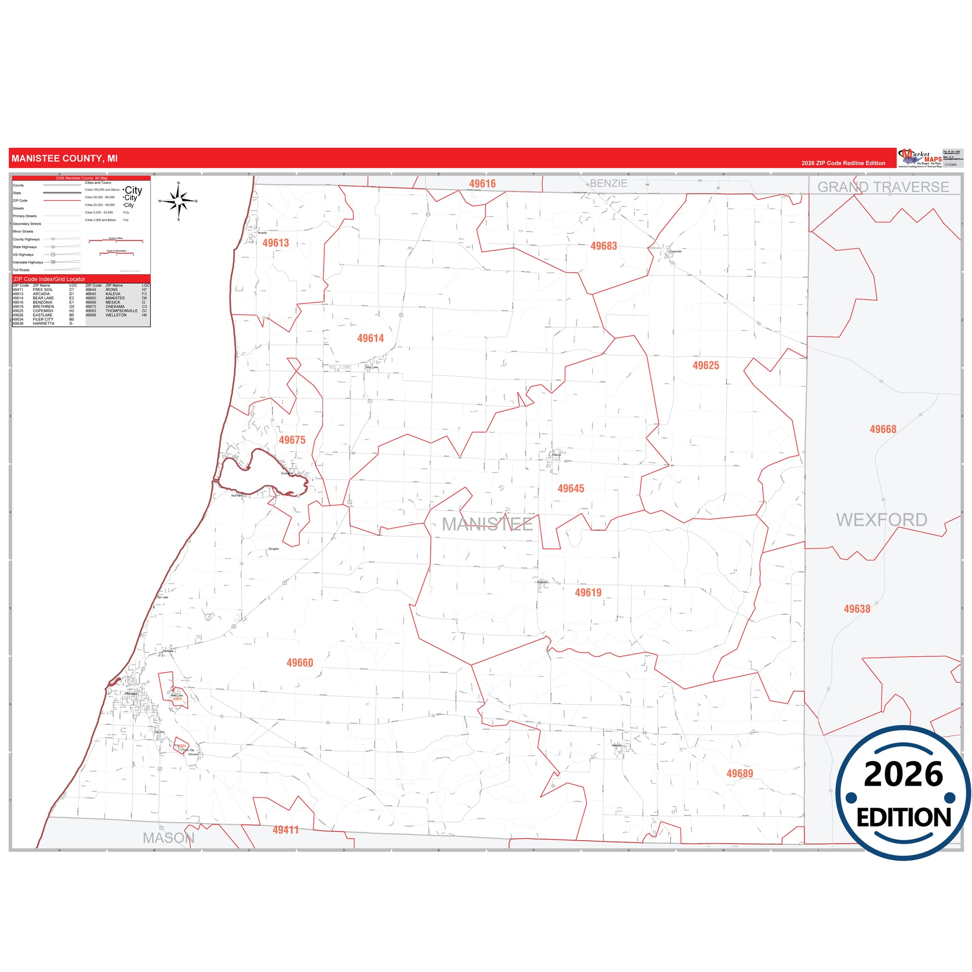 The RedLine Style map of Manistee County, MI shows ZIP code areas overlaid on a detailed road network of Manistee County, Michigan. Ideal for drawing locations, territories, and other applications. Base map features include all major streets and highways labeled, cities and towns, county and state boundaries, neighborhood names, railroads, and a clean white background suitable for marking and planning.