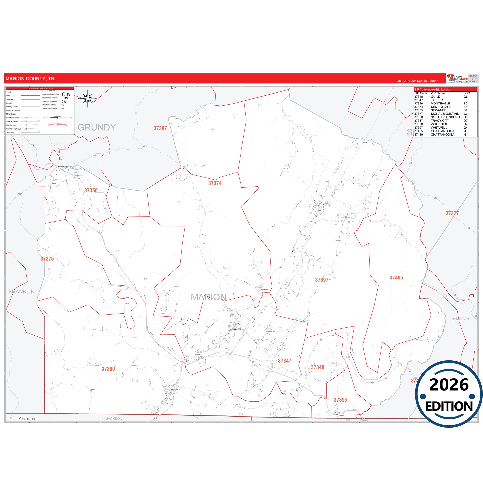 The RedLine Style map of Marion County, TN shows ZIP code areas overlaid on a detailed road network of Marion County, Tennessee. Ideal for drawing locations, territories, and other applications. Base map features include all major streets and highways labeled, cities and towns, county and state boundaries, neighborhood names, railroads, and a clean white background suitable for marking and planning.