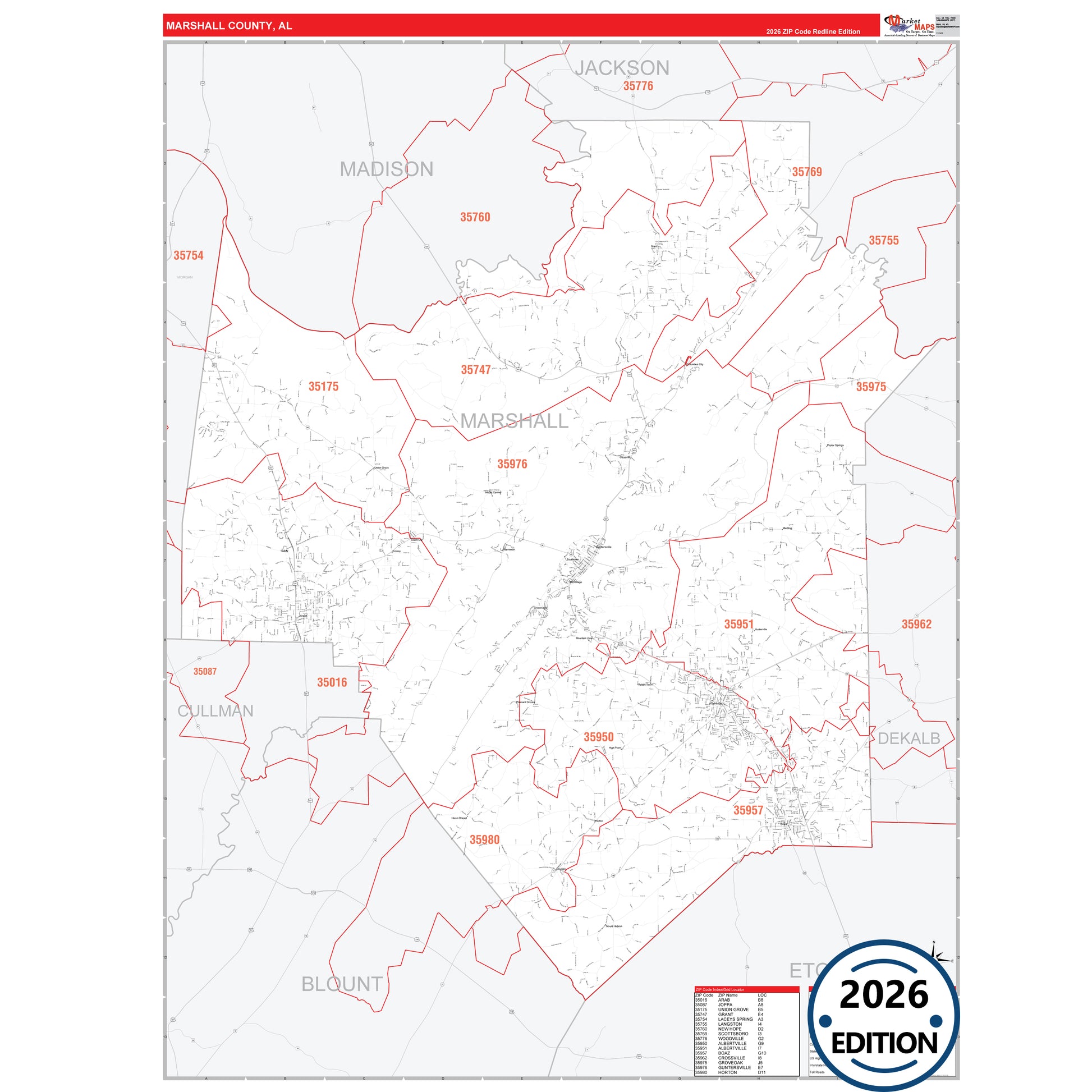 The RedLine Style map of Marshall County, AL shows ZIP code areas overlaid on a detailed road network of Marshall County, Alabama. Ideal for drawing locations, territories, and other applications. Base map features include all major streets and highways labeled, cities and towns, county and state boundaries, neighborhood names, railroads, and a clean white background suitable for marking and planning.