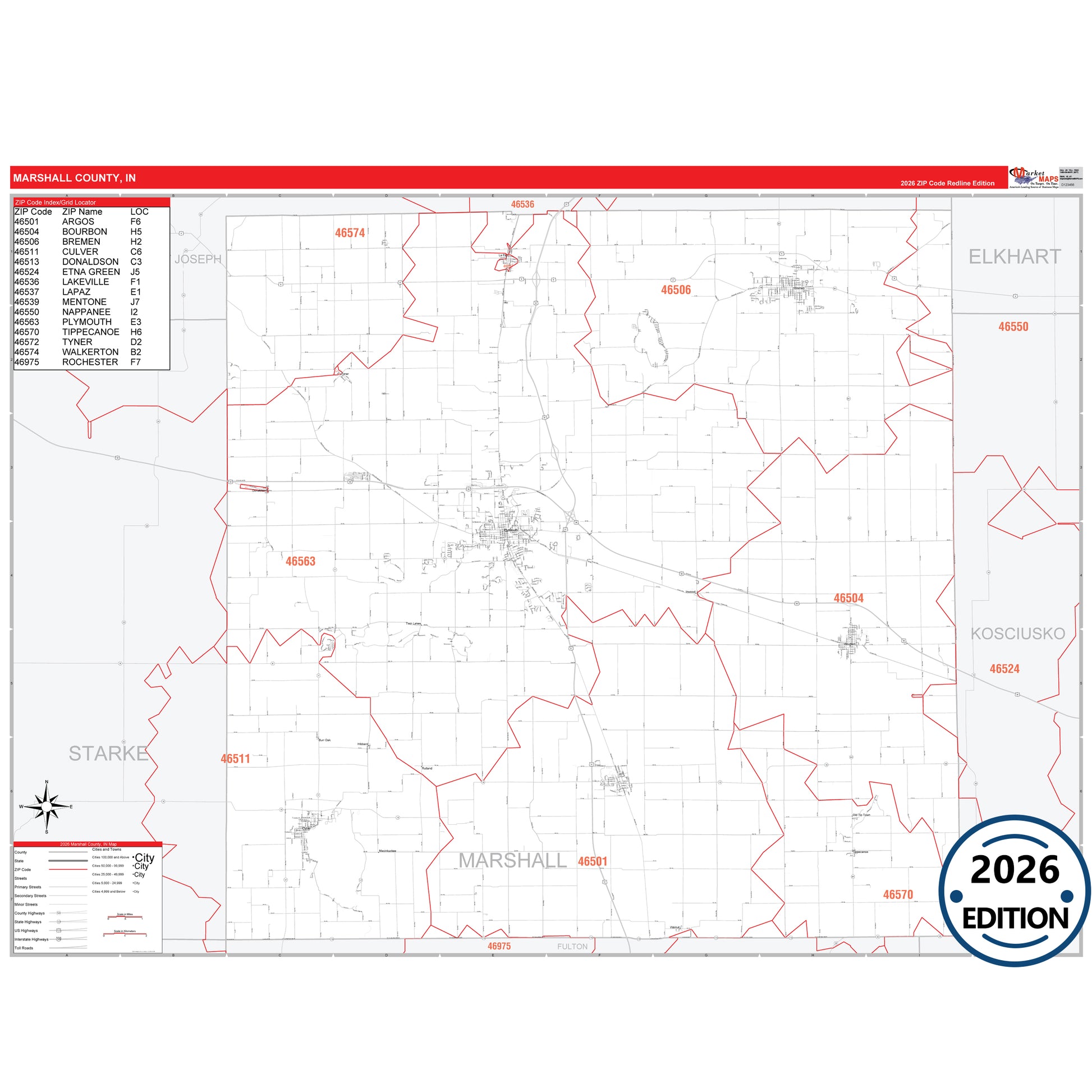 The RedLine Style map of Marshall County, IN shows ZIP code areas overlaid on a detailed road network of Marshall County, Indiana. Ideal for drawing locations, territories, and other applications. Base map features include all major streets and highways labeled, cities and towns, county and state boundaries, neighborhood names, railroads, and a clean white background suitable for marking and planning.
