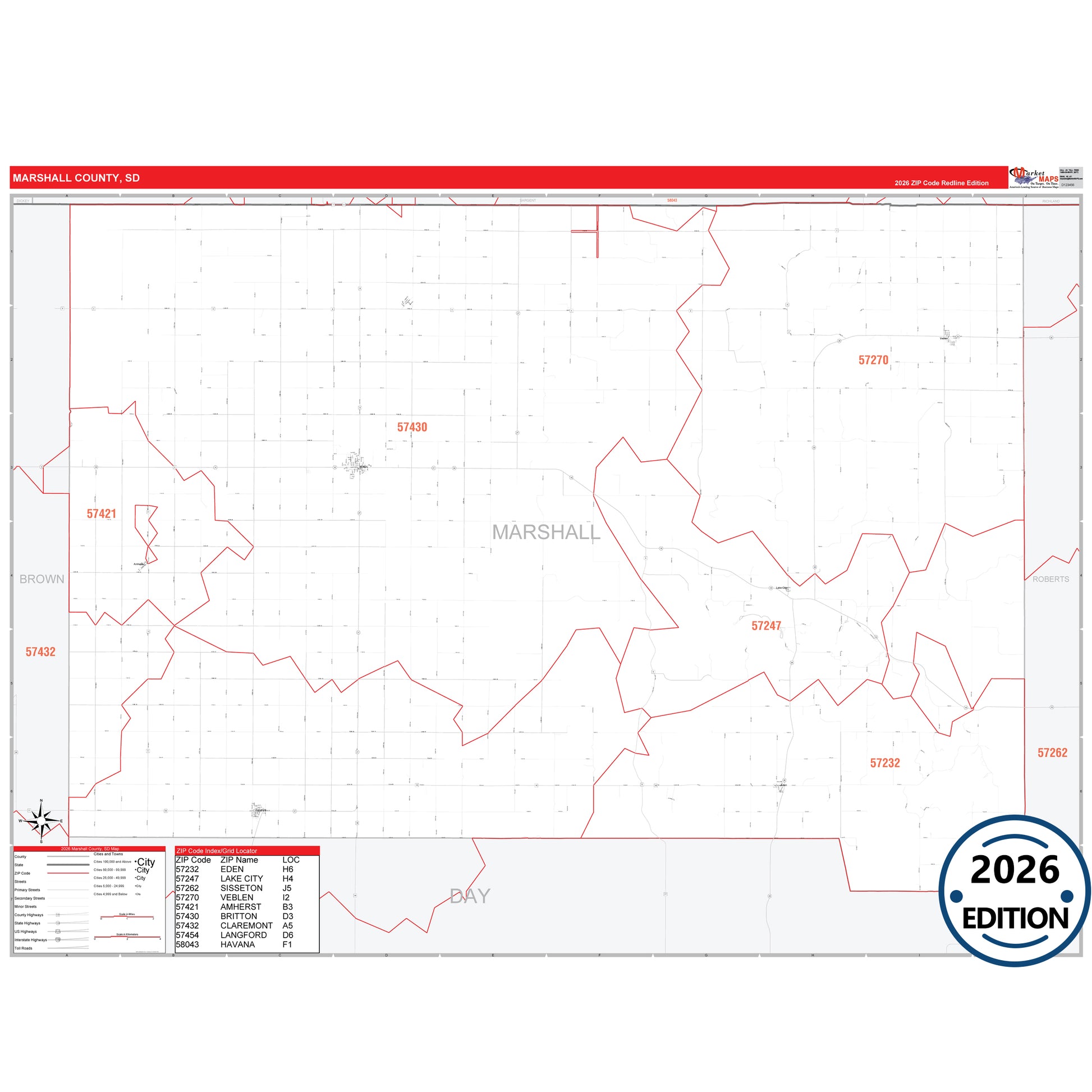 The RedLine Style map of Marshall County, SD shows ZIP code areas overlaid on a detailed road network of Marshall County, South Dakota. Ideal for drawing locations, territories, and other applications. Base map features include all major streets and highways labeled, cities and towns, county and state boundaries, neighborhood names, railroads, and a clean white background suitable for marking and planning.